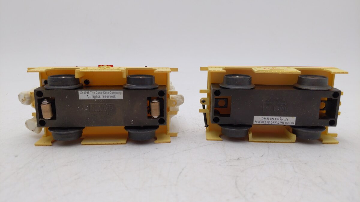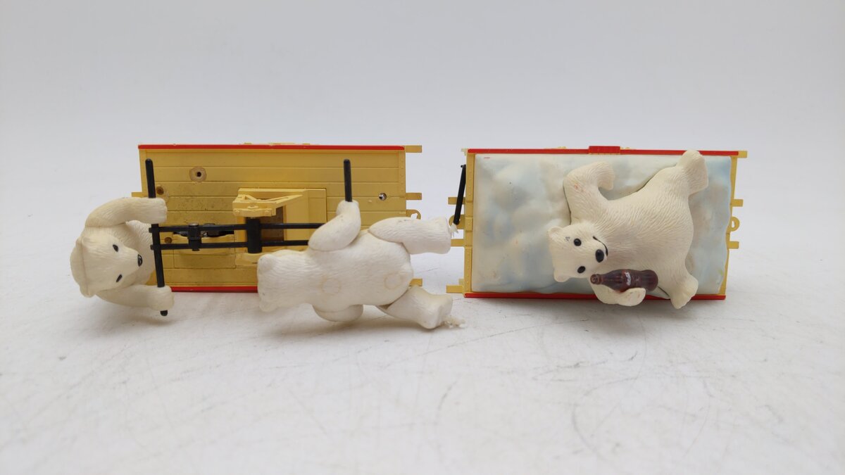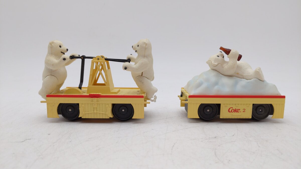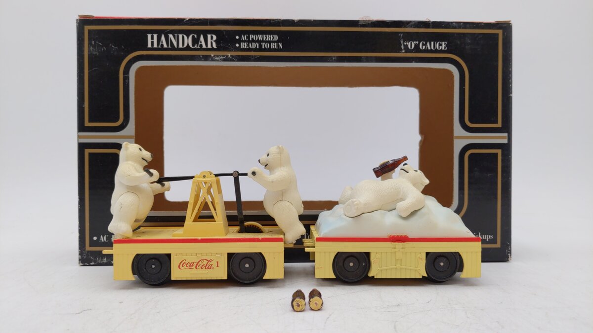Here is a K-Line K-2625-02 Coca Cola Hand Car with Polar Bears pulling a trailer with another Polar bear relaxing drinking a coke. The handcar is motorized, and when it runs it looks like the two bears pumping the handcar handle are actually powering the car. It will run on both O27 and O Gauge track.
