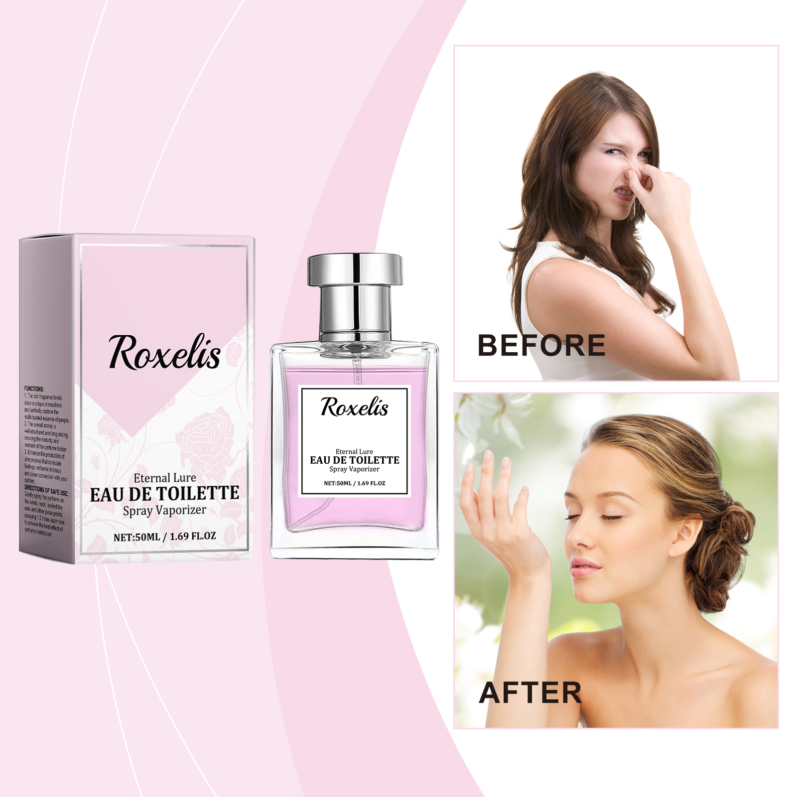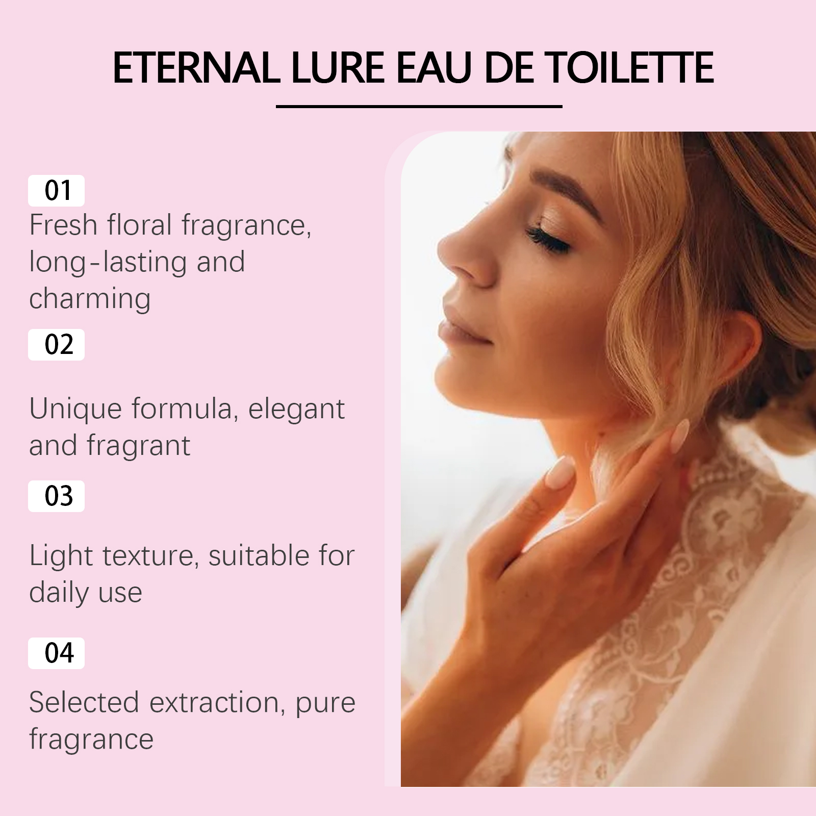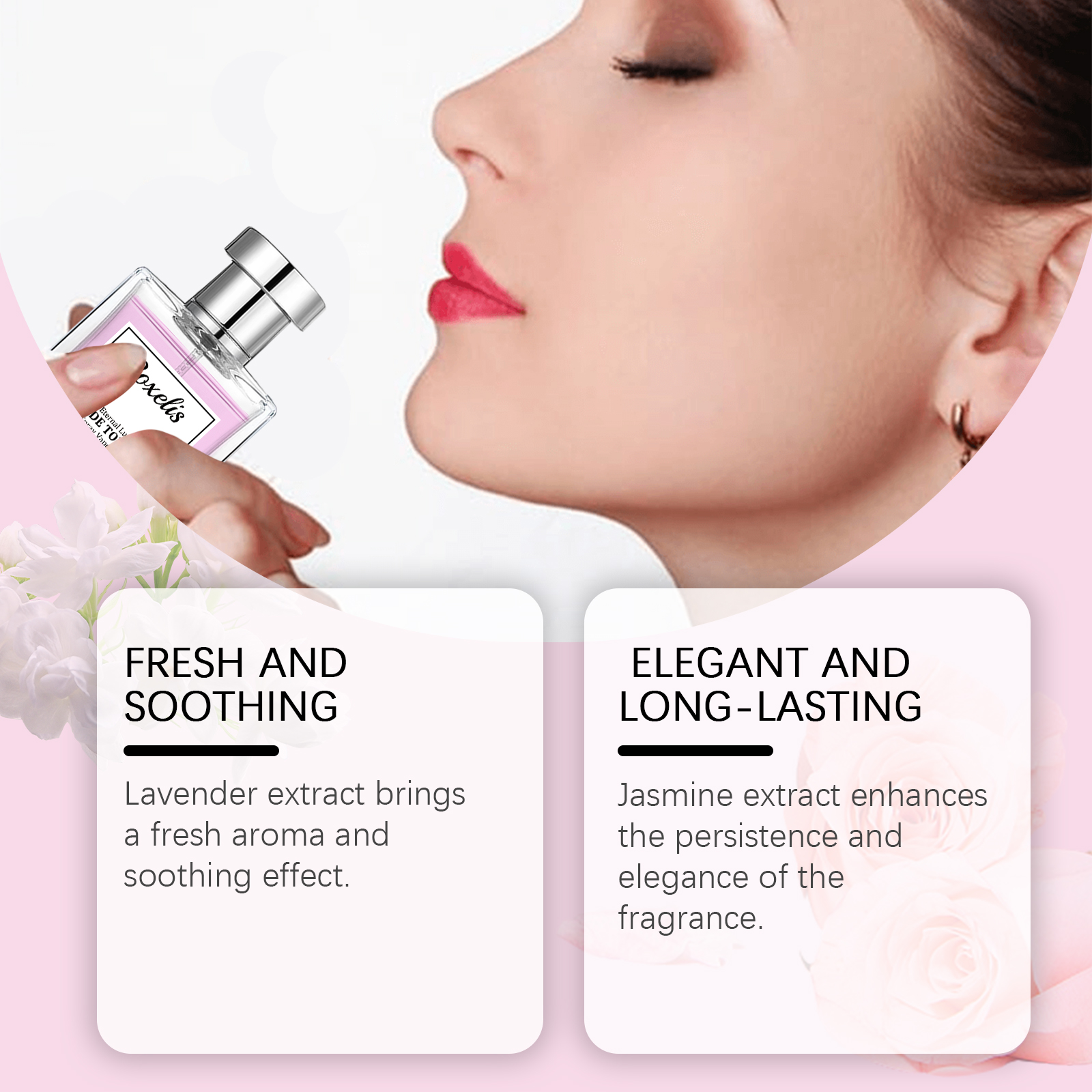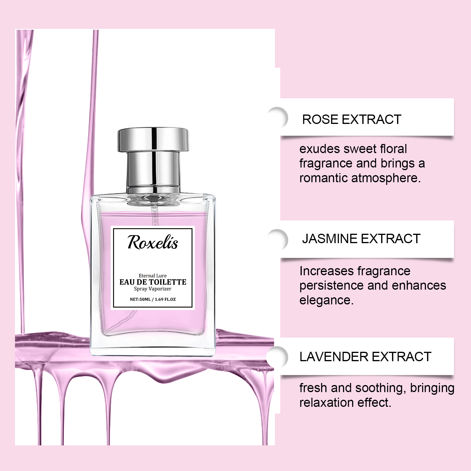 Our rose eau de toilette is carefully blended with lavender extract and patchouli leaf extract. Designed specifically to add depth and complexity. The usage method is extremely convenient: Gently spray the perfume on the pulse points such as the wrist, neck, and behind the ears. Spray 1-2 times each time to achieve the best perfume distribution effect. And it can enhance the persistence and elegance of the fragrance.