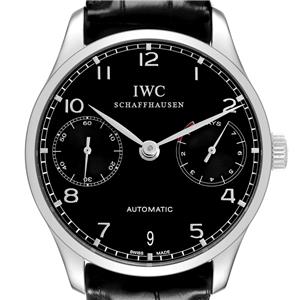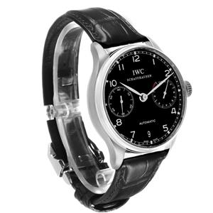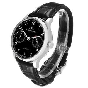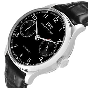 Black dial with raised Arabic numeral hour markers. Leaf shaped hands. Date window at 6 o'clock. 60 seconds and 7 days power reserve sub-dials. Minute markers around the outer rim. |