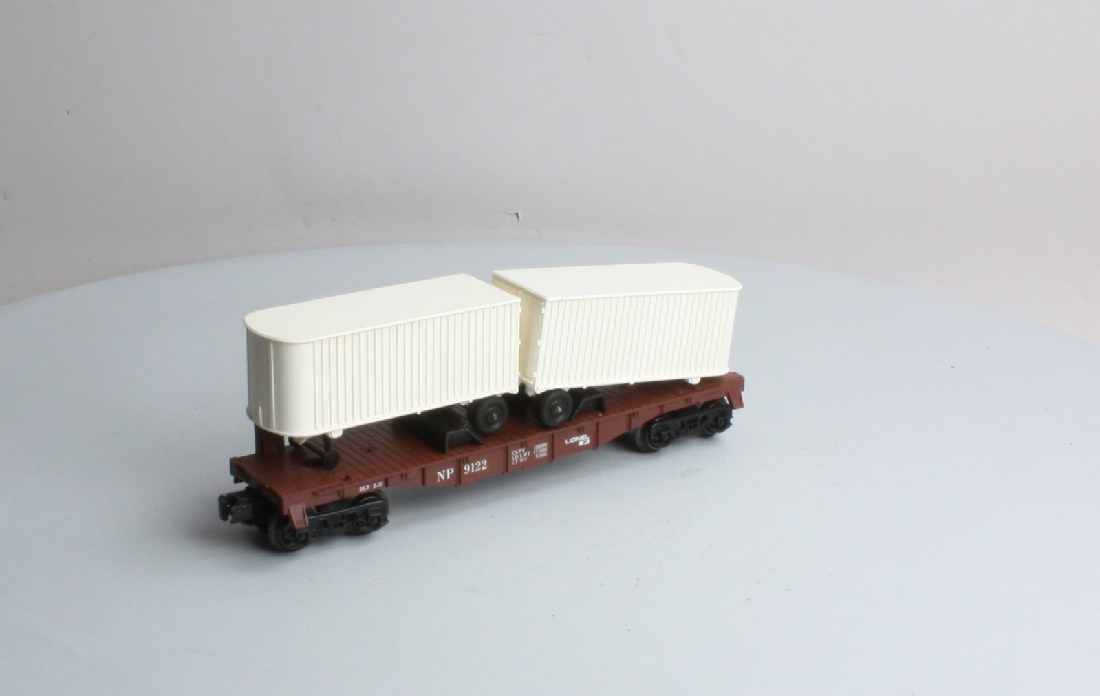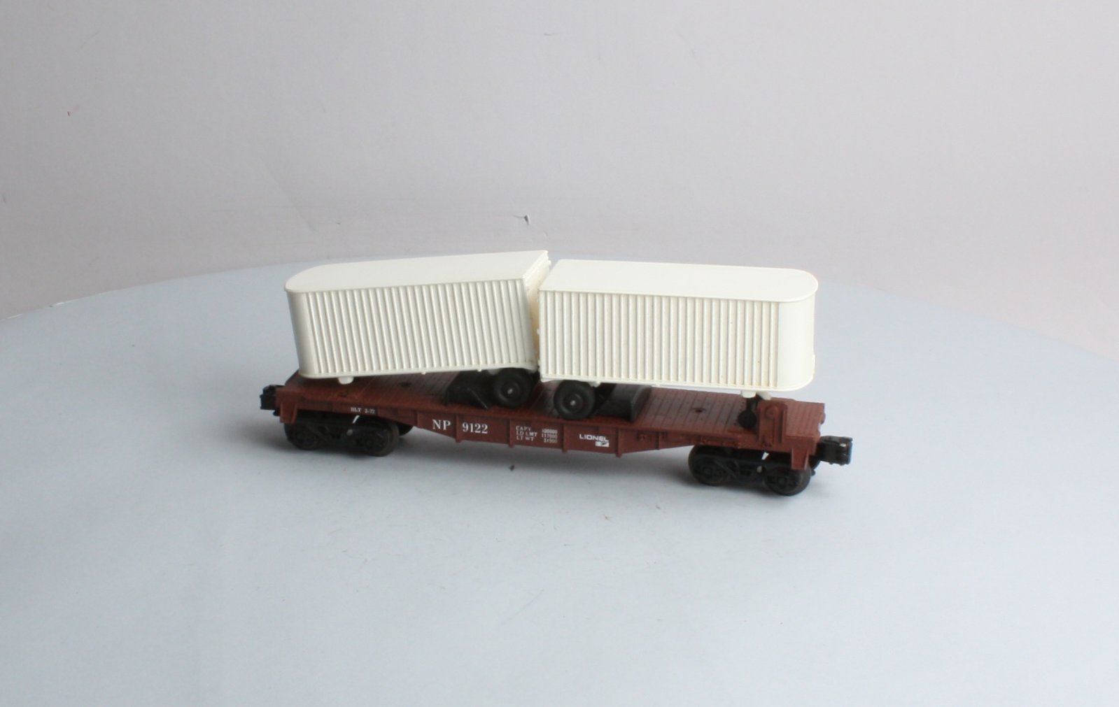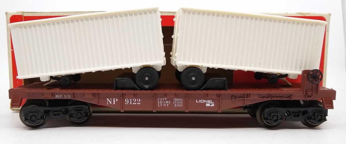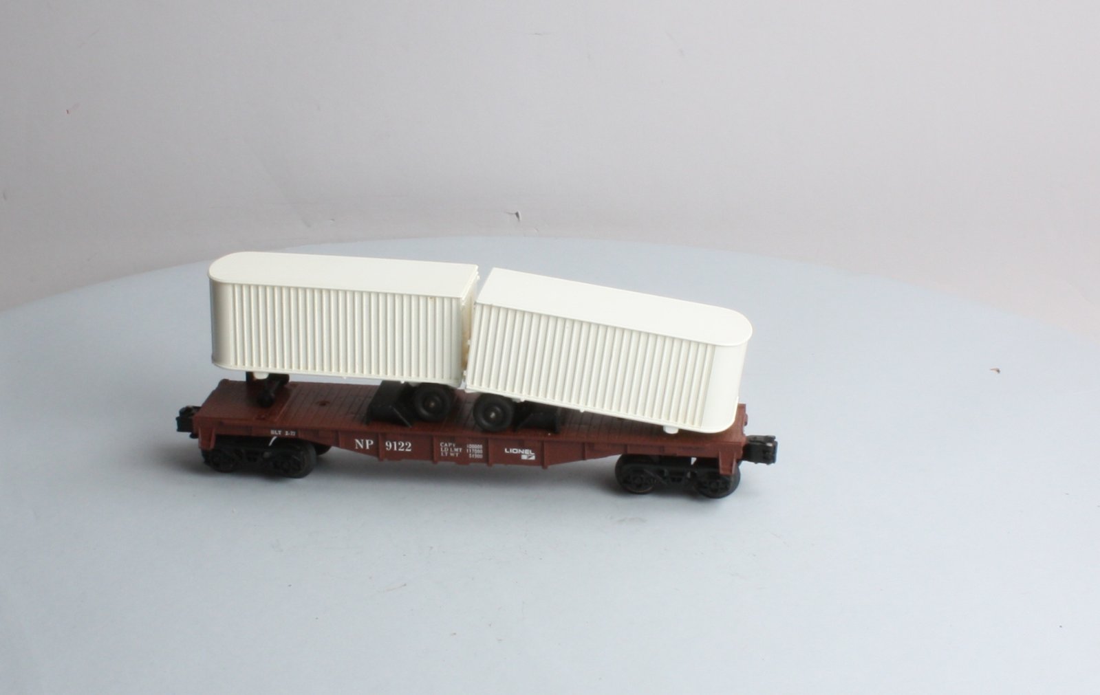 Here is a Lionel 9122 Northern Pacific Flatcar with Vans. This flatcar features 2 removeable vans, plastic trucks, operating knuckle couplers, metal wheels and axles.
