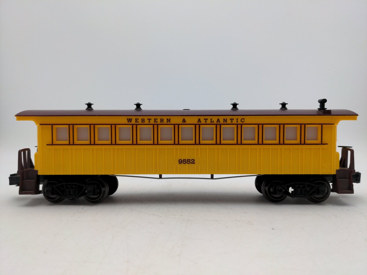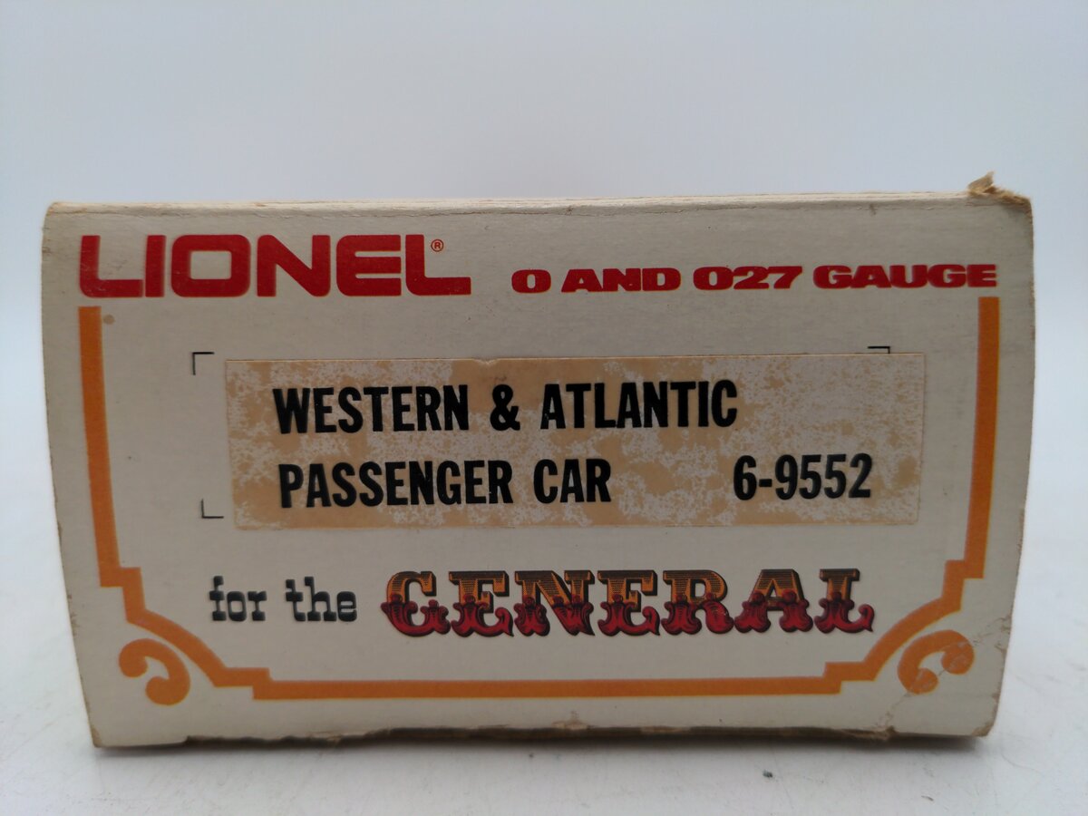This is a Lionel 9552 Western and Atlantic General Style Coach Car from 1977-80. This coach car features interior illumination, plastic trucks, operating knuckle couplers, metal wheels and axles. It measures 11 inches long.