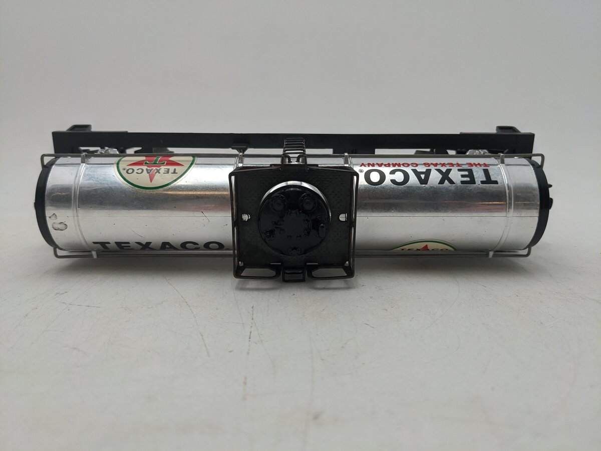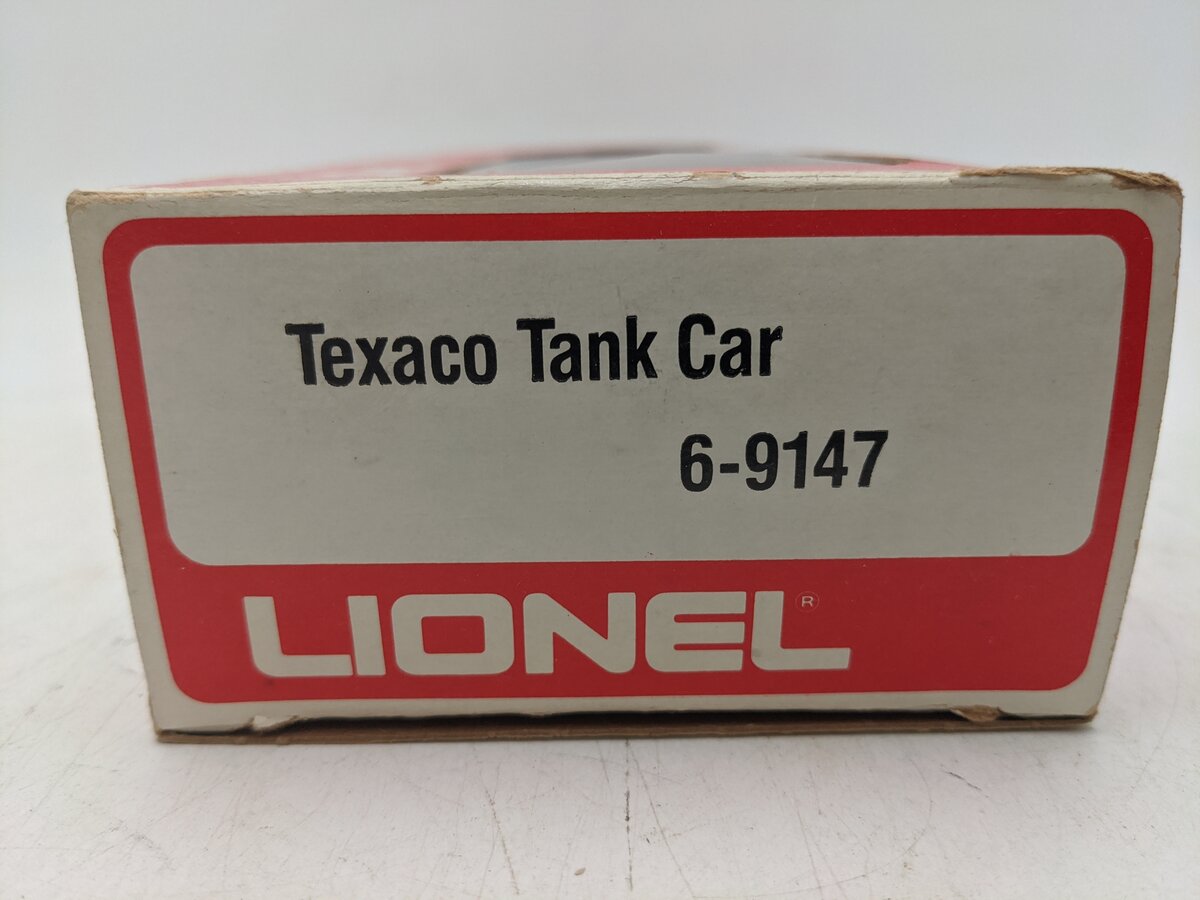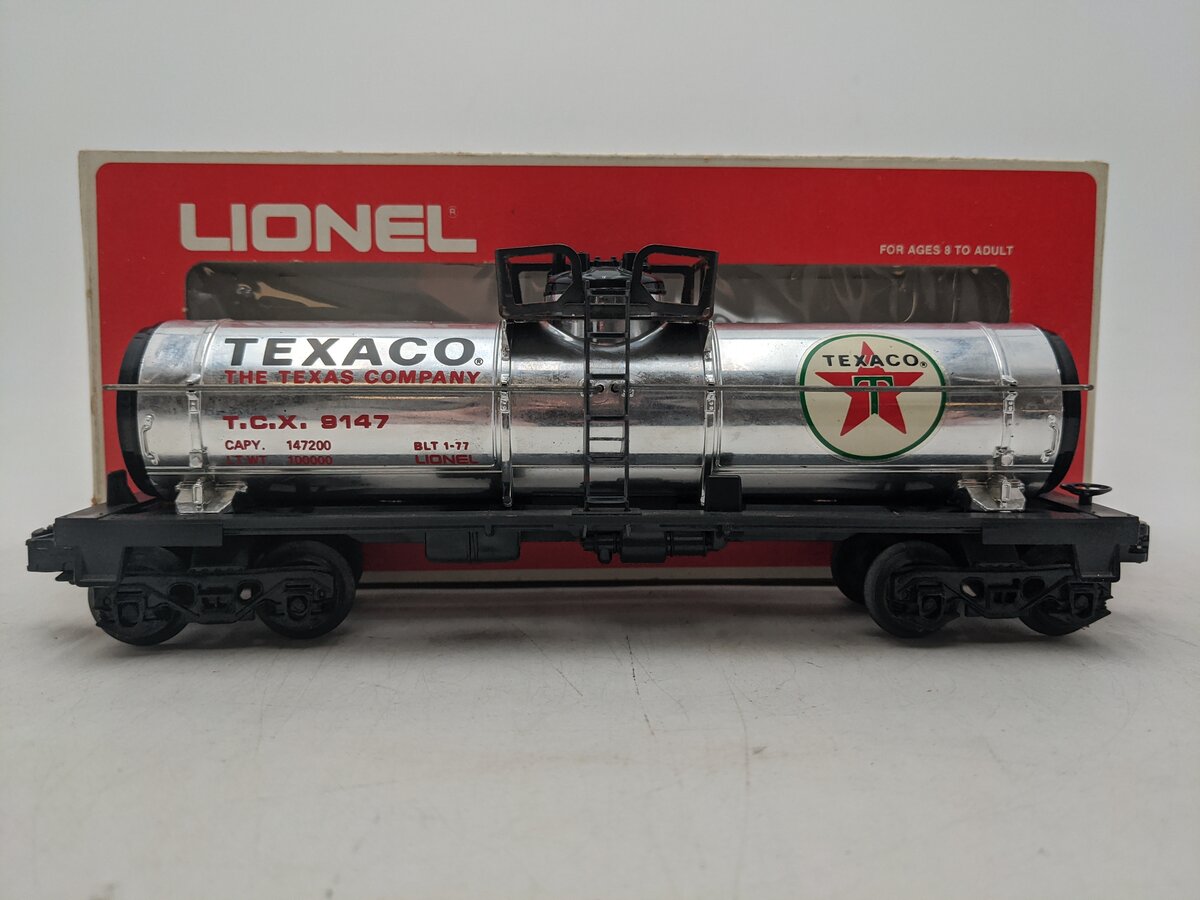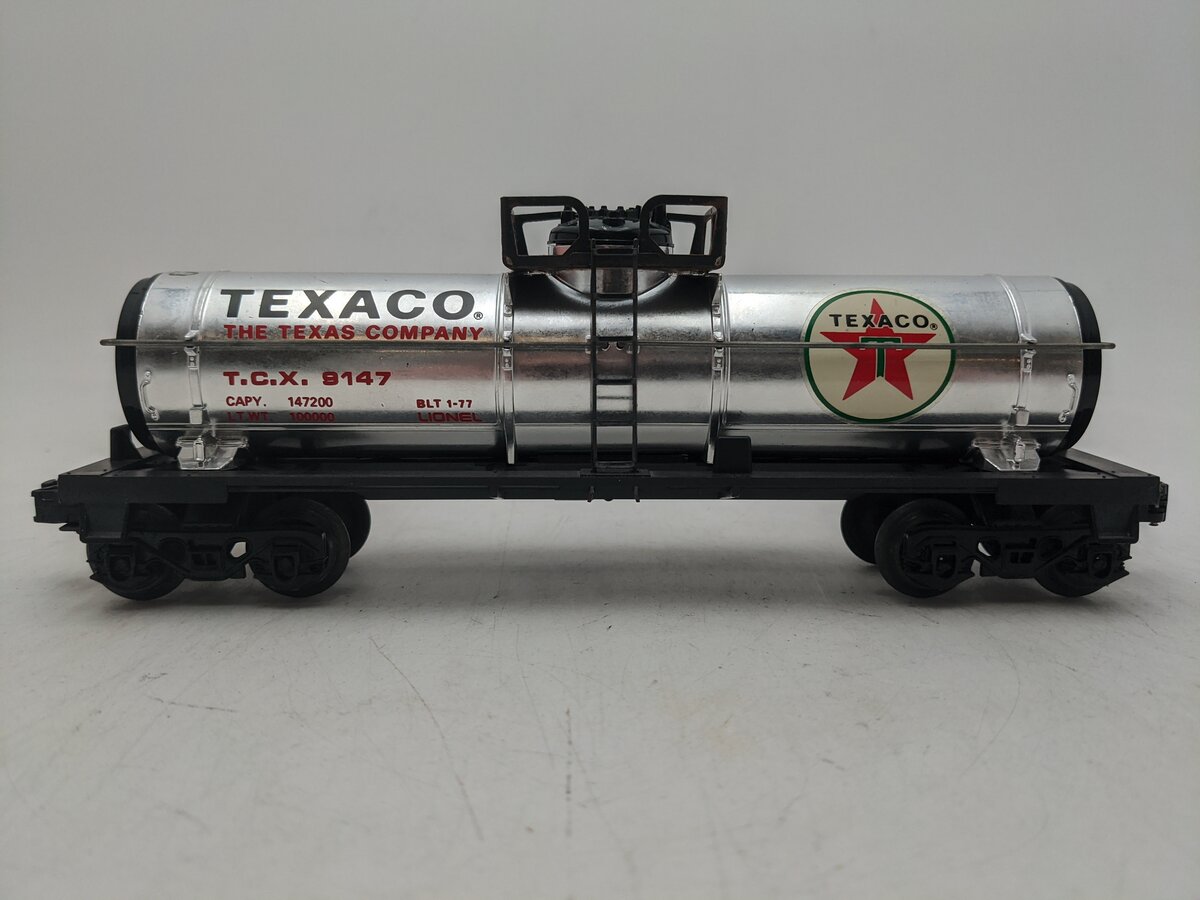 This is a Lionel 6-9147 O Gauge Texaco Single Dome Tank Car from 1977-78. This tank car features plastic trucks, operating knuckle couplers, metal wheels and axles.