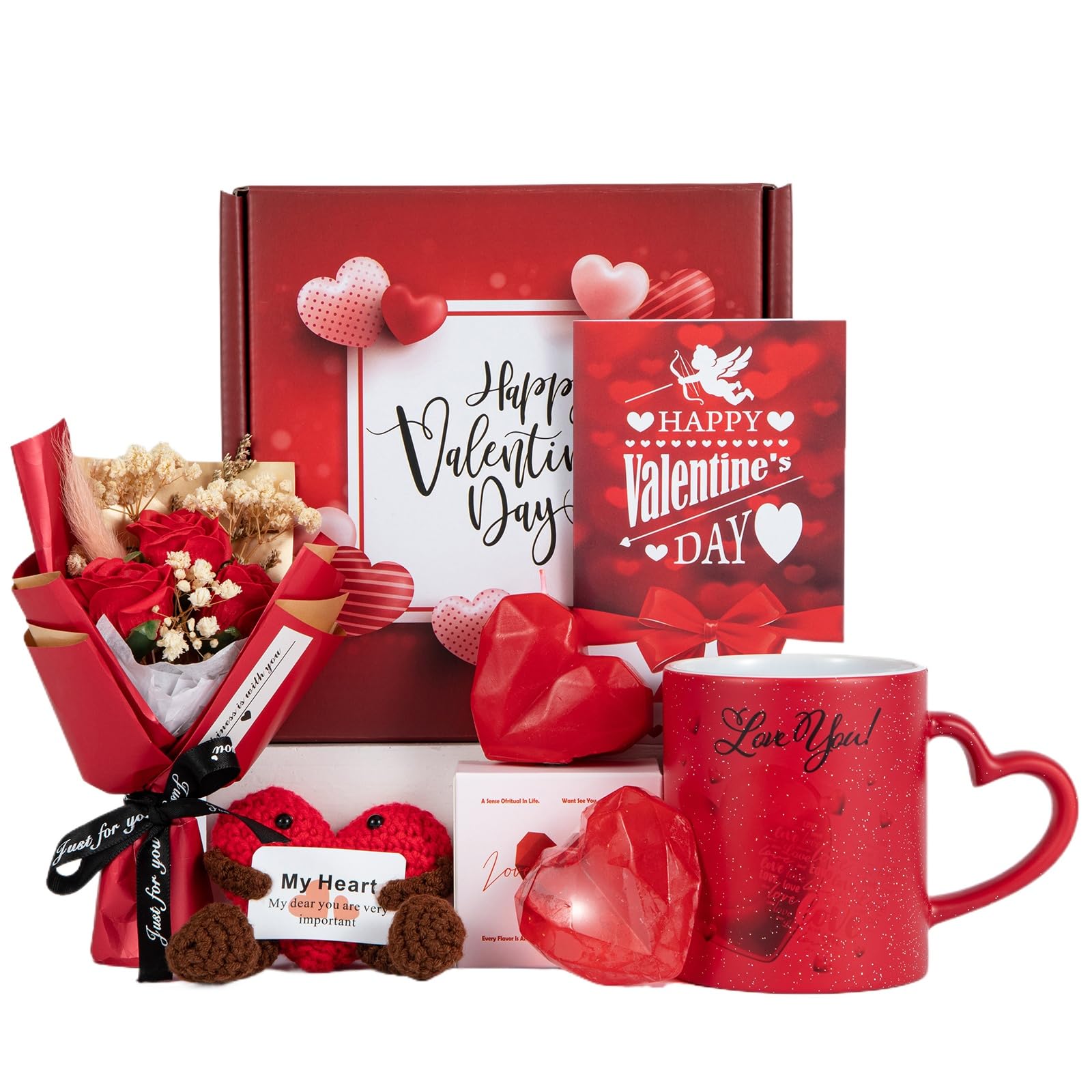 Valentine's Day Gifts: This valentine's day gift basket includes 6 items - a 12 oz Magic Coffee Mug, a Scented Candle, a Handmade Knitted Crochet Heart Ornaments,a Handmade bar soap, a Greeting Card,and A bouquet of dried soap rose