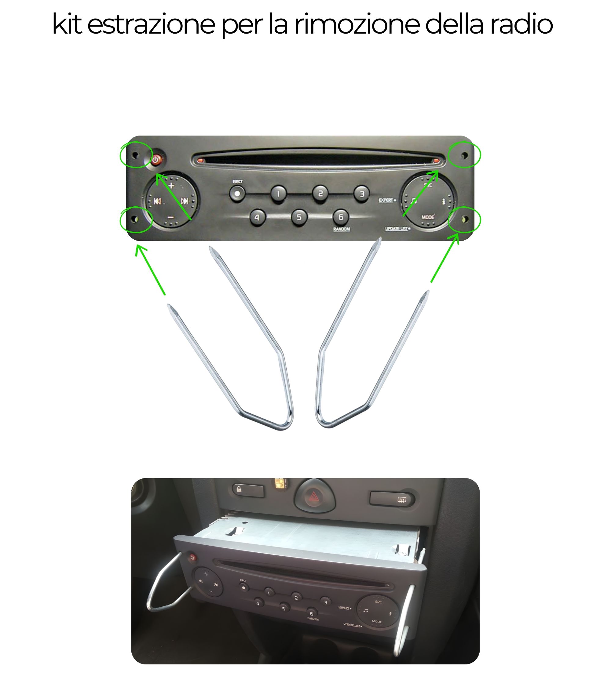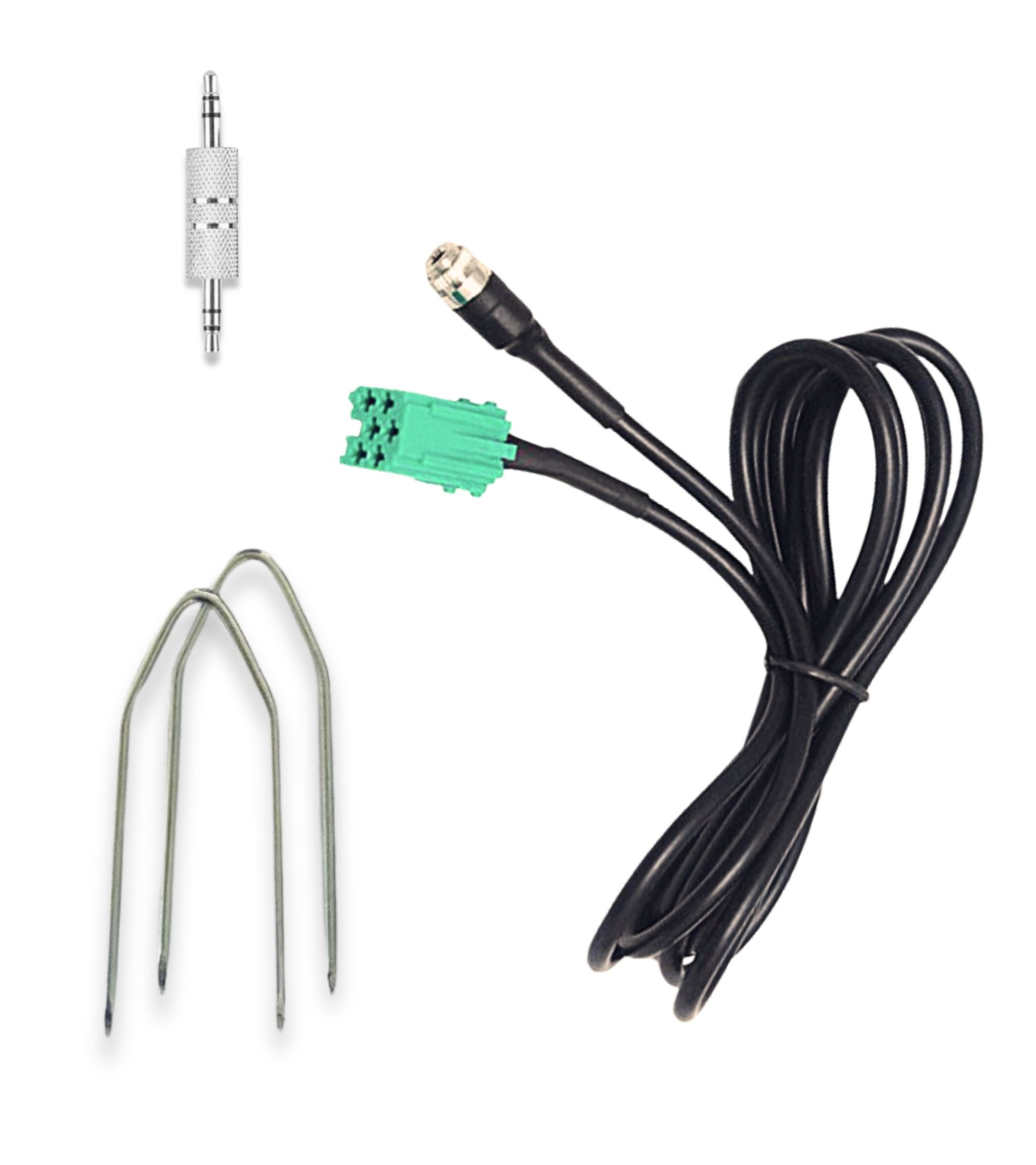 Il kit comprende un cavo con funzione ausiliaria AUX con jack femmina, un adattatore con doppio jack maschio e un pratico kit di estrazione per la rimozione dell’autoradio.
