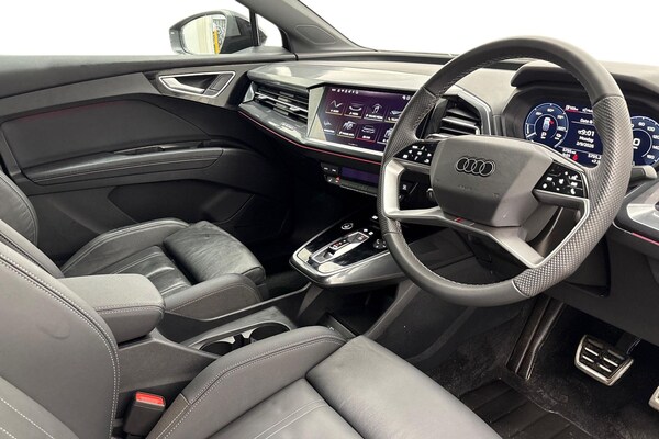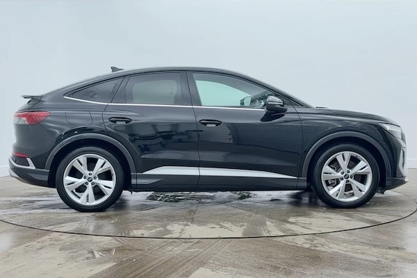 Joining our Audi Approved range, is this Q4 Sportback S Line 40 e-tron in Mythos Black with its 20"" 5-Y-spoke alloy wheels which look superb out on the roads. The LED headlights with LED rear lights create that strong visibility in all weather conditions. The climate control can be adjusted to your prefered climate on all journeys. This Q4 has some brilliant features, such as the heated front seats which are perfect for those cooler mornings. The reversing camera creates that additional vision and assists greatly whilst maneuvering those tighter spaces. Another great feature, is the Ambient lighting package plus, which enhances the cabins ambience and improves visibility of controls at night. Connectivity is made seamless on all journeys, thanks to the Bluetooth Interface. Planning and following routes is a breeze, with the MMI Navigation plus with MMI Touch. The 4-way lumbar support for the front seats is great for maximising comfort behind the wheel. The multimedia interface allows the driver and front passenger to access a range of different media, such as Apple Carplay and Android Auto, allowing you to use apps like Spotify, Google Maps, Apple Music and other apps also. The Audi drive select feature lets you choose your prefered drive mode on any journey, for a more personalised driving experience. The driver assist can also be adjusted to your driving preference on all journeys. ISOFIX is fitted to the outer rear seats of this vehicle which allows this vehicle to c...