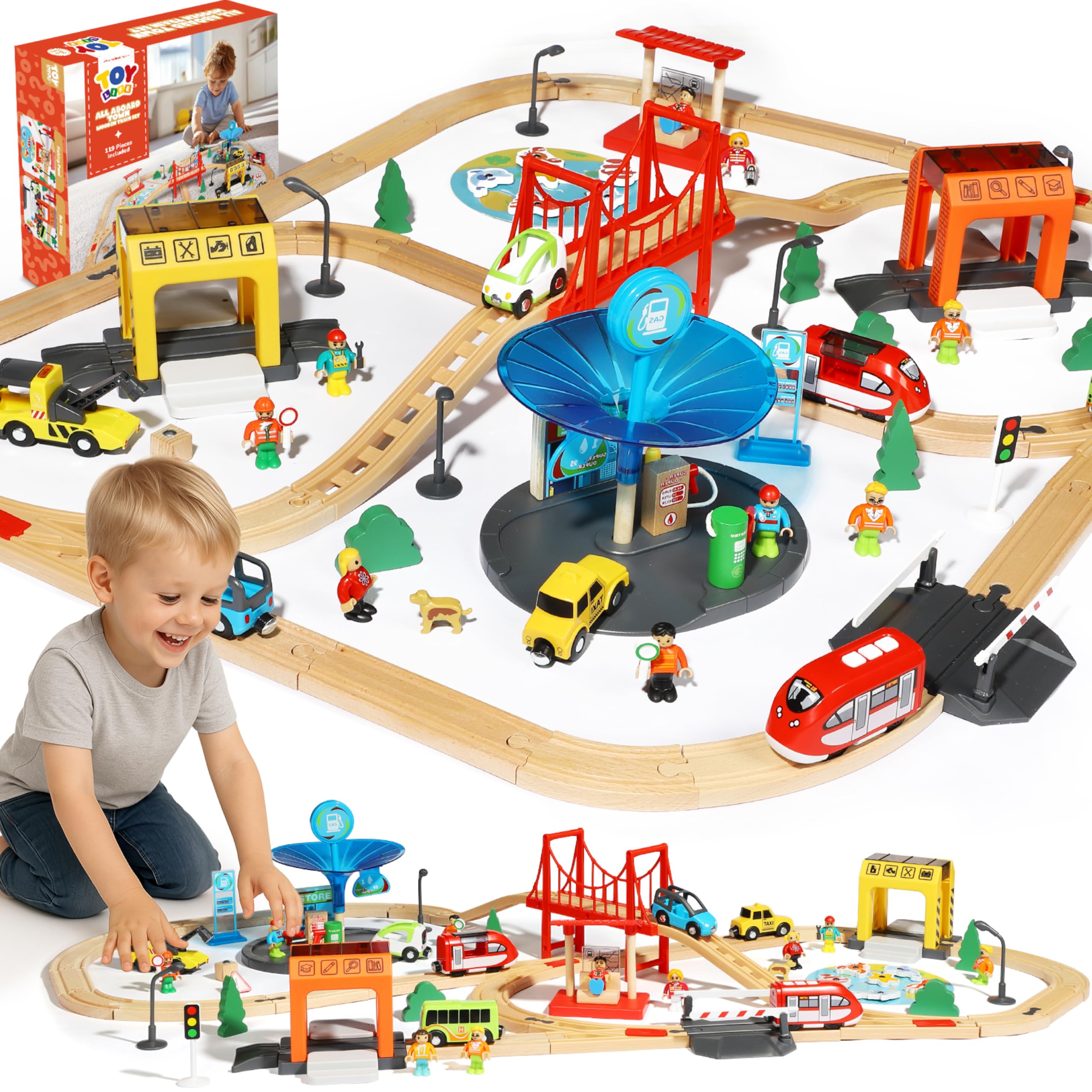 TOY Life Wooden Train Set for Toddlers 2-4, 119PCS City Train Toys with Wooden Train Track, Electric Train Set for Kids 4-8, Toddler Toys for 3 4 5 6 Year Old Boys Girls, Compatible with Major Brand
