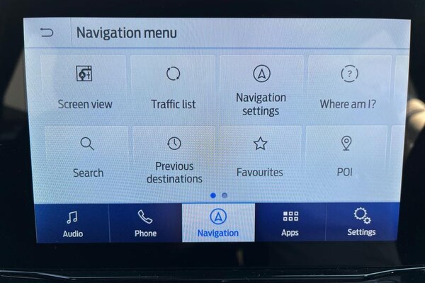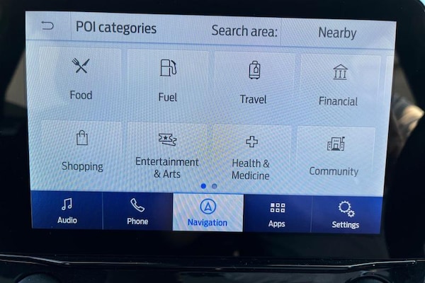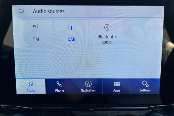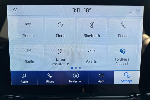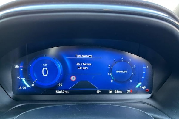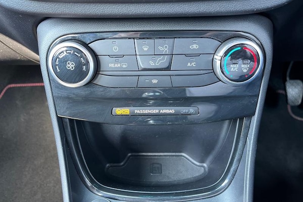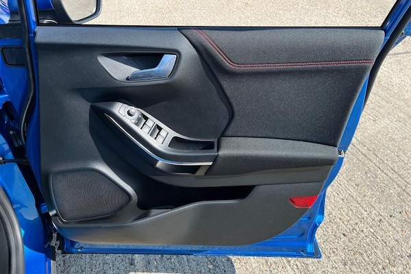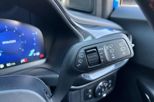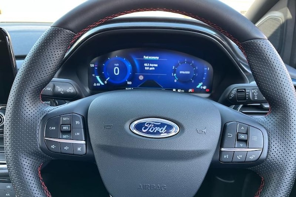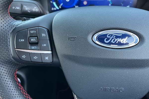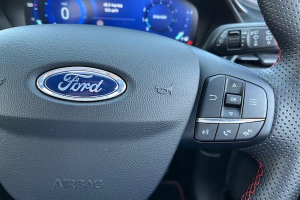 Driver impairment monitor, Emergency call service, Ford easy fuel, Full digital 12.3 instrument cluster, Lane keeping aid with lane departure warning, Power assist steering, Power start button, Rear parking sensor, Selectable drive modes(Normal, Eco, Sport, Slippery and Trail), Speed sign recognition, Automatic headlights with auto high beam, Automatic rain sensing wipers, LED rear lamps, Power foldable heated door mirrors with puddle lamps, Projector headlamps with LED day time running lights and front fog lamps, Quickclear heated windscreen, Rear side wing doors, Rear wiper, ST-Line body styling kit with unique grille, Third brake light, 3 seat bench in 2nd row, Centre console with armrest and stowage, Ford megabox extended bootspace, Front and rear head restraints, Front floor mats, Manual 2 way passenger seat adjustment, Manual 4 way driver seat adjust with lumbar adjustment, Single front passenger seat, ST- Line cloth trim with red stitching, ST-Line flat bottomed sensico leather steering wheel with leather handbrake and aluminium gear knob, 3 rear seatbelts, Child safety lock, Electronic stability control (ESC) and hill start assist, Pedestrian/cyclist detection & post-collision braking, Pre collision assist system, Tyre pressure monitoring system (TPMS)