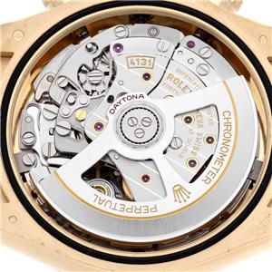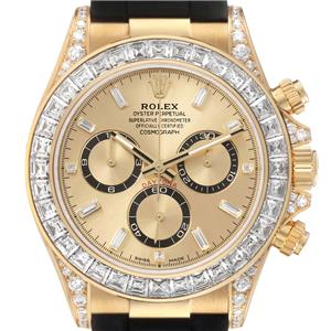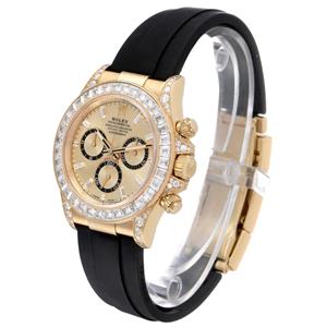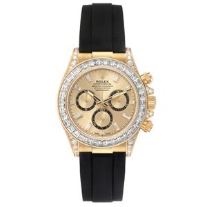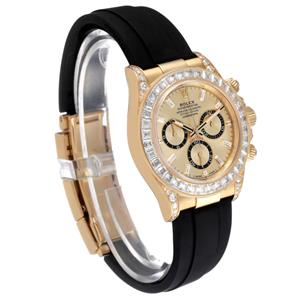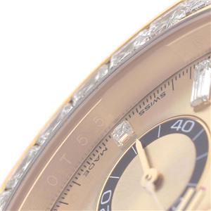 Champagne dial with Rolex factory diamond set hour markers. Luminescent hour and minute hands. Centre chronograph hand. Three champagne chronograph sub-dials -- 30-minute counter at 3 o'clock, small seconds at 6 o'clock, and 12-hour counter at 9 o'clock. |