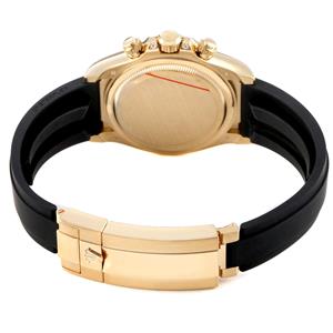Black rubber Oysterflex strap with an 18k yellow gold flip lock clasp. |