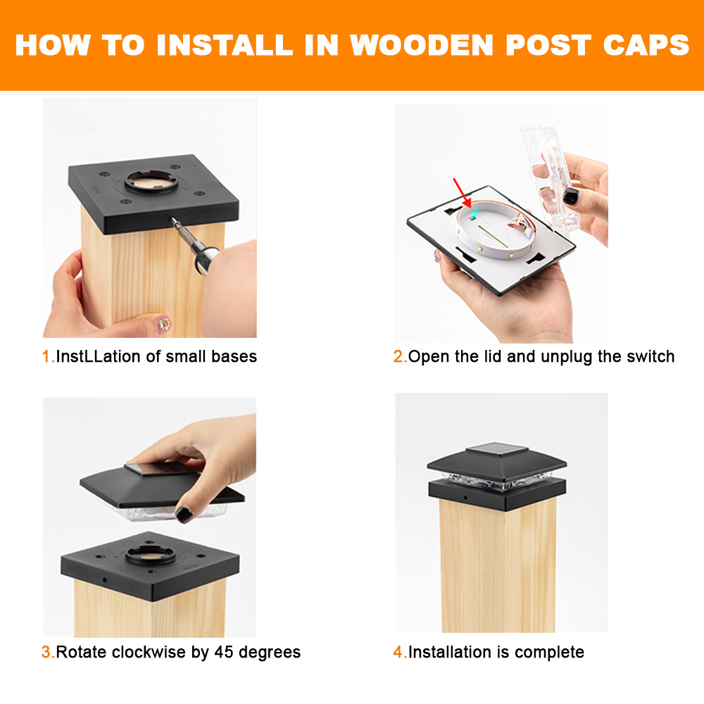 4x4 Post Solar Lights: The solar post cap lights measures 4.25x4.25x2.28 inches,You can mount the solar post cap lights on 4x4(actual 3.5x3.5) inchs wooden post caps,or you can mount solar fence post lights on 4x4(actual 4x4) inches vinyl post cap.