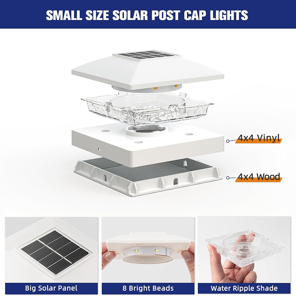 Upgraded 8pcs Solar Post Cap Light: Upgraded solar post cap light enhances its utility while adding elegance to your outdoor space! First, the 8pcs LEDs refract more ambient light through the upgraded lens, much brighter than other solar lights. Secondly, the upgraded lampshade is less likely to be knocked off when you are walking or running.