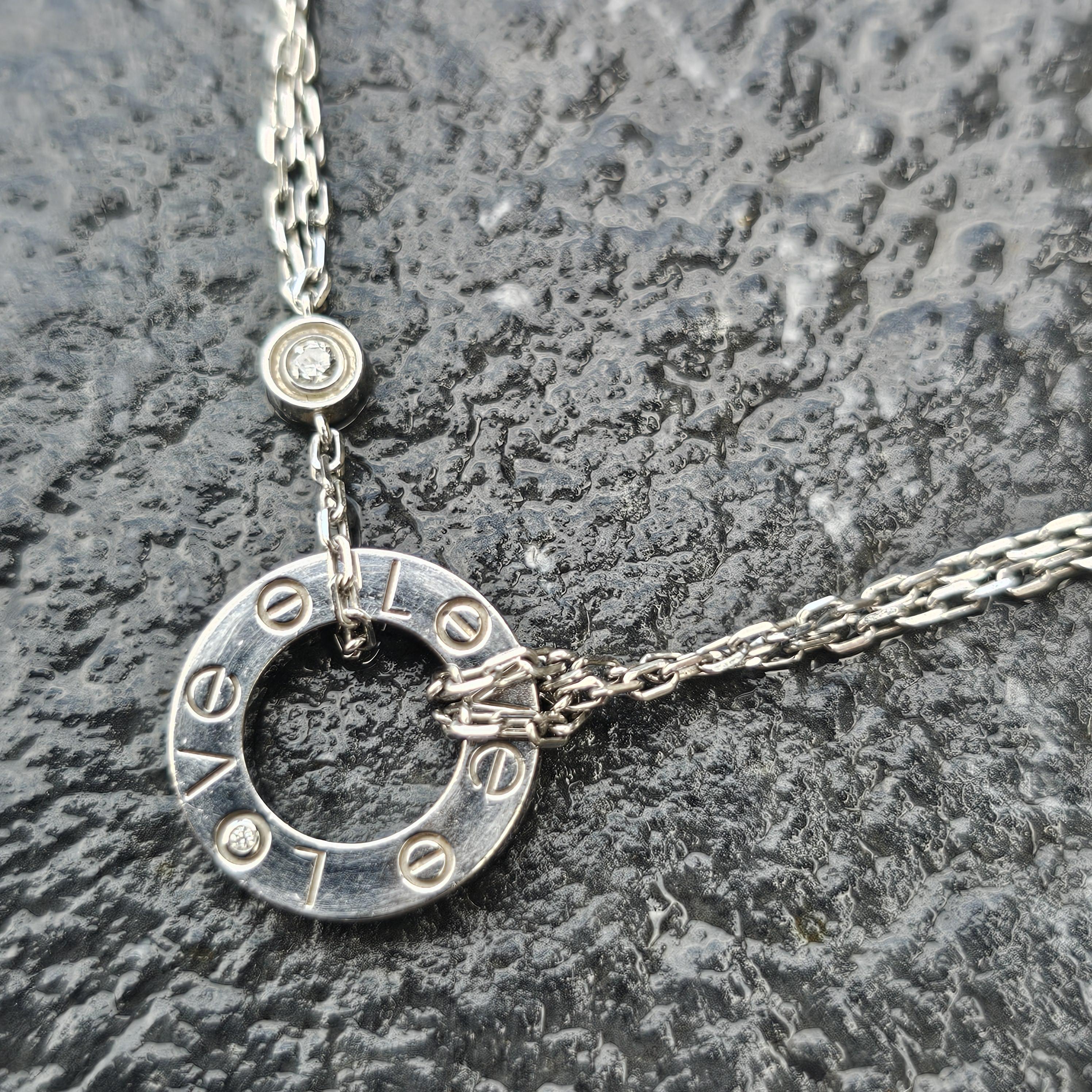 Elevate your jewelry collection with this Cartier 2 diamond Love pendant necklace. The necklace features a circular pendant inscribed with the word "LOVE," adorned with a white diamond for a touch of brilliance, with a larger diamond on the chain. Crafted from 18k white gold, it exudes luxury and sophistication.