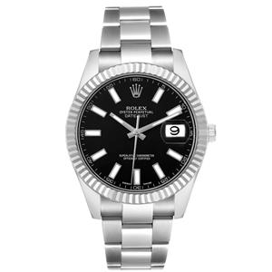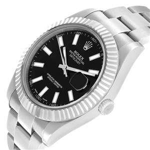 Black dial with luminescent white gold baton hour markers and hands. Date calendar at the 3 o'clock aperture.