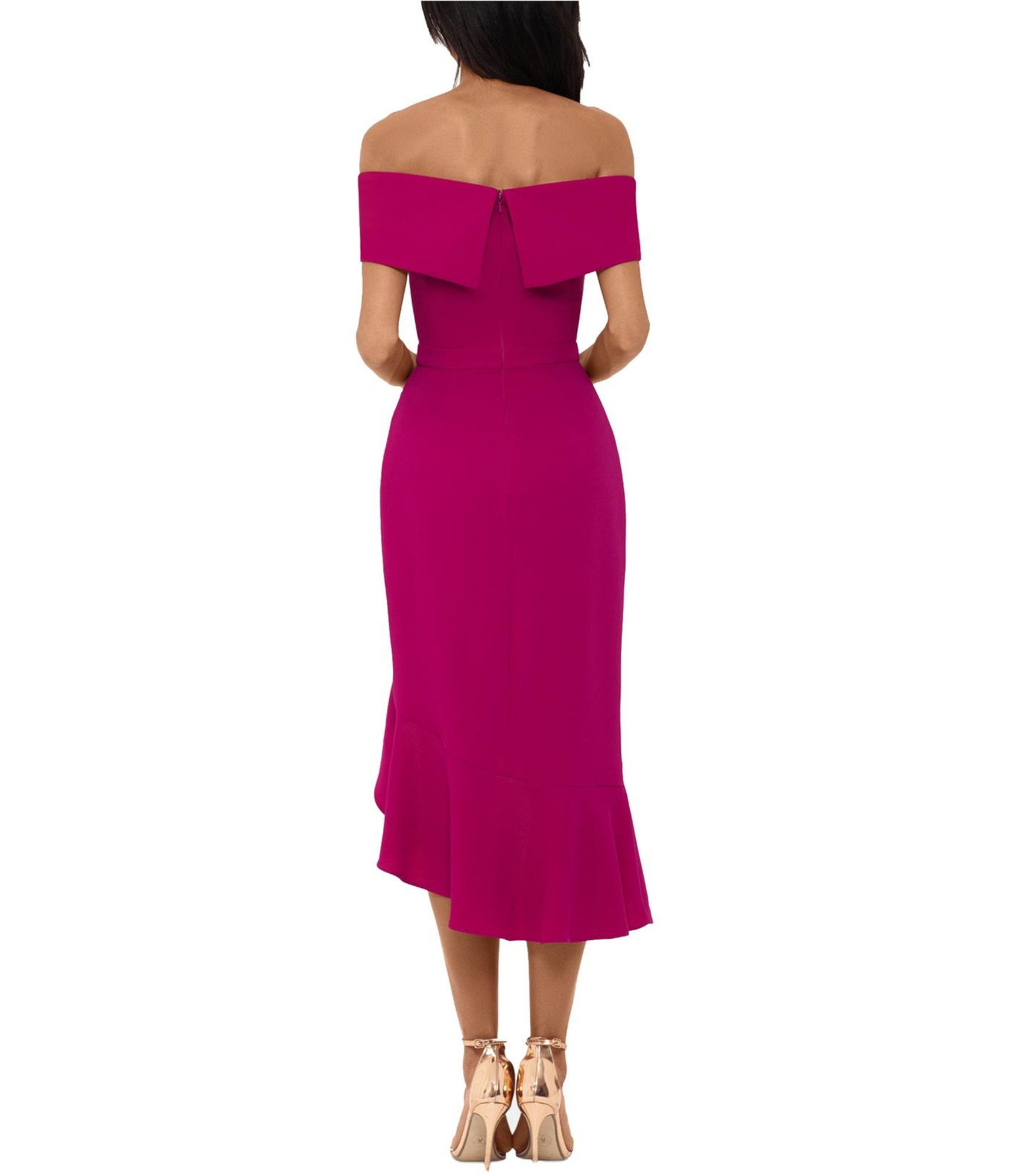 Command attention at your next cocktail event in this stunning XSCAPE midi dress. The off-the-shoulder neckline and ruffled flounce hem create a sophisticated silhouette, while the asymmetrical styling adds a modern, playful touch. The built-in bra ensures a flawless fit, making it the perfect choice for any special occasion where you want to feel confident and chic. Step into the spotlight and leave a lasting impression. Crafted from a medium-weight woven fabric, this dress offers a flattering fit and elegant drape. Whether you're mingling on the dance floor or enjoying a candlelit dinner, this dress promises to make you feel utterly glamorous. Its solid pattern and collarless design keep the focus on your radiant presence. Prepare to turn heads and own the night.