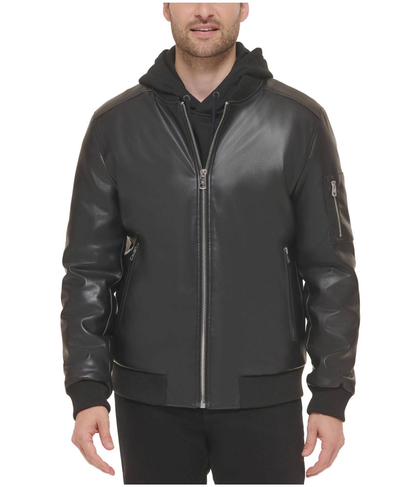 Calvin Klein Mens Faux Leather Rib Knit Trim Bomber Jacket, black, S