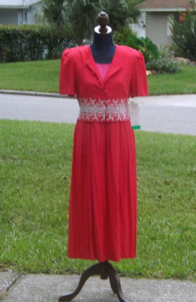 Ladies red, beaded dress from Periwinkle, made from 65% rayon and 45% acetate with 100% acetate lining (top portion is partially lined only)