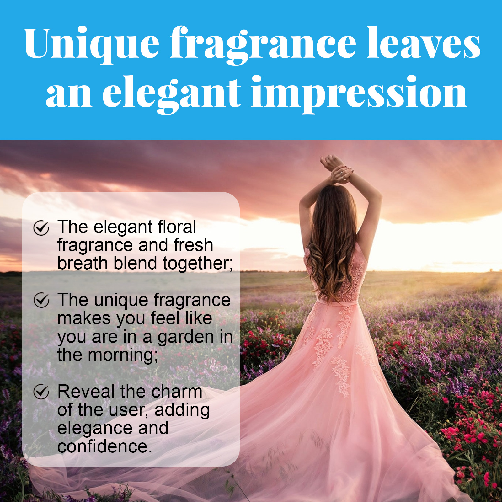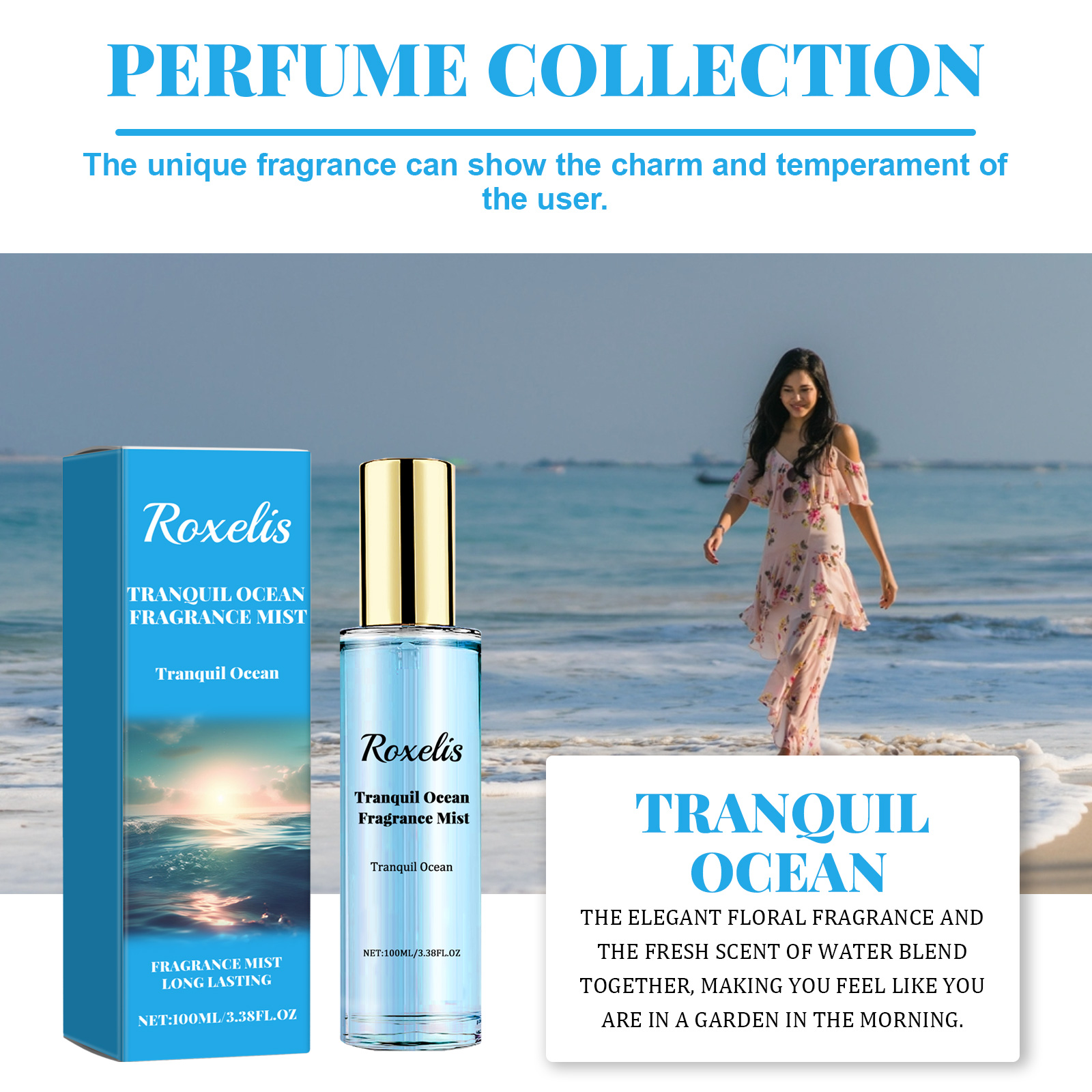 Our Tranquil Ocean Fragrance Mist contains Bellis Perennis(Daisy) Flower Extract, Juniperus Virginiana Oil, Citrus Reticulata (Tangerine)Leaf Oil. It can highlight your charm add elegance and confidence, make yourself stand out in social situations, attract more attention and appreciation, help create a romantic atmosphere, increase the attraction of emotional communication, make the date more memorable. Its use method is very simple: spray the perfume on the wrists, neck, behind the ears, or spray the perfume in the air and then mist, so that the perfume evenly distributed throughout the body, leaving a fragrant aroma. Elegant flowers and fresh breath blend together, unique fragrance, let you feel as if you are in the garden in the morning.