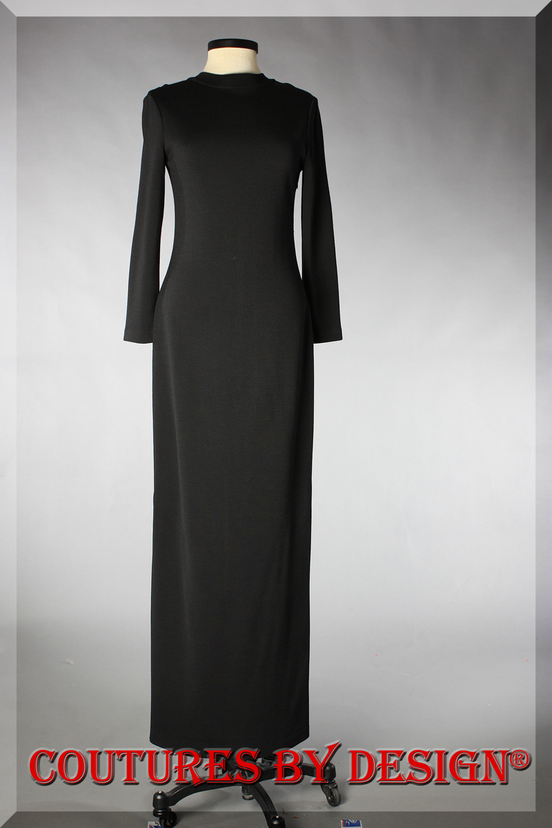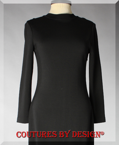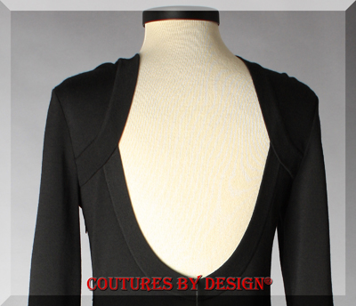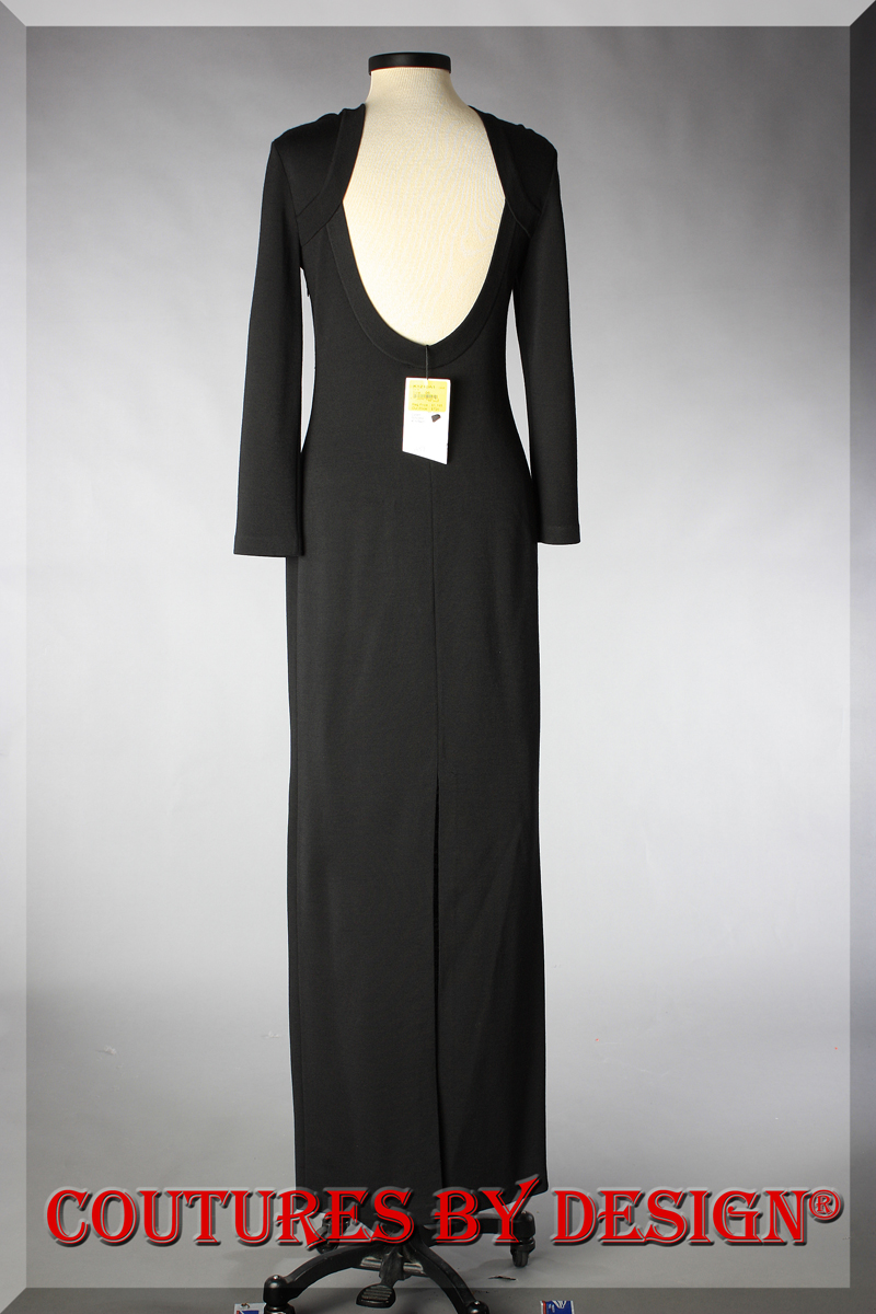 St. John Knits 3/4 sleeve evening gown with high jewel neck front and deep scoop back in Caviar black. One inch ribbing around the back scoop. 12 inch concealed side zipper with a center back seam.25 inch center back slit. The deep scoop measures 14 inches from the shoulder seam.