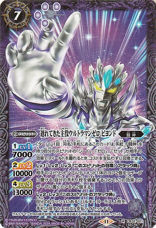 Battle Spirits ■Single card■★Battle Spirits collaboration booster "Ultraman ~Imagination Power~" (BS-CB32) included ■Card Name: The Belated Protagonist Ultraman Zero Beyond ■Card Name: The BelatedProtagonist Ultraman Zero Beyond ■Rarity: Secret ■Type : Spirit ■Cost: 7/Reduction symbol: 4/Purple/■★Battle Spirits collaboration booster "Ultraman ~Imagination Power~" (BS-CB32) included ■Card Name: The Belated Protagonist Ultraman Zero Beyond ■Card Name: The BelatedProtagonist Ultraman Zero Beyond ■Rarity: Secret ■Type: Spirit ■Cost: 7/Reduction Symbol: 4/Purple/Fighting God ■Lv Cost: (1) Lv1 7000 (2) Lv2 10000 (4) Lv3 13000 ◆ [Once per turn: same name] This card in your hand reduces the cost when your spirit's "Ged"/"Zero"/"Zet" with family "Fighting God" leaves the field due to the opponent's effect. Can be summoned without paying. ◆Lv1/Lv2/Lv3 ``When summoning/attacking this spirit'' You can put 2 cores of 1 opposing spirit/ultimate into the reserve. By discarding a card from your hand, add 2 cores to your reserve with this effect. ◆LV2/LV3 "When this spirit attacks" Return 1 "Bulky Chorus" from your trash to your hand, or pay 1 cost and set it. ■Symbol: Purple