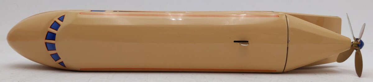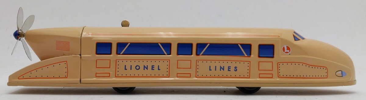 Here is a Lionel 6-21060 Schylling Rail Zeppelin. The engine is 13 inches long and sleek, bullet shaped design. The rear fan is connected to a live shaft from the motor drive. It spins fast as the engines sails around the track. Not electric. It comes with a wind up key.