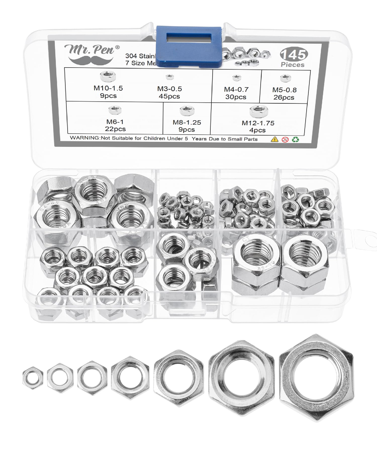 Mr. Pen hex nuts assortment kit includes 145 pieces, offering a selection of 7 different metric sizes for diverse fastening tasks.
