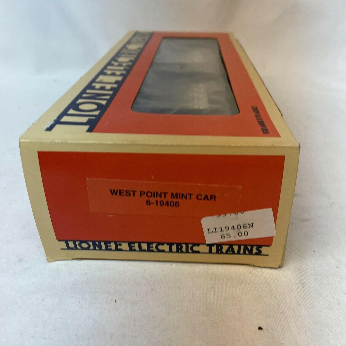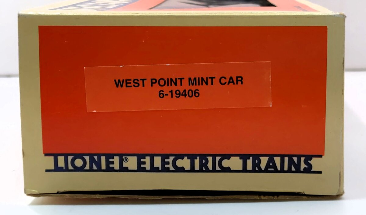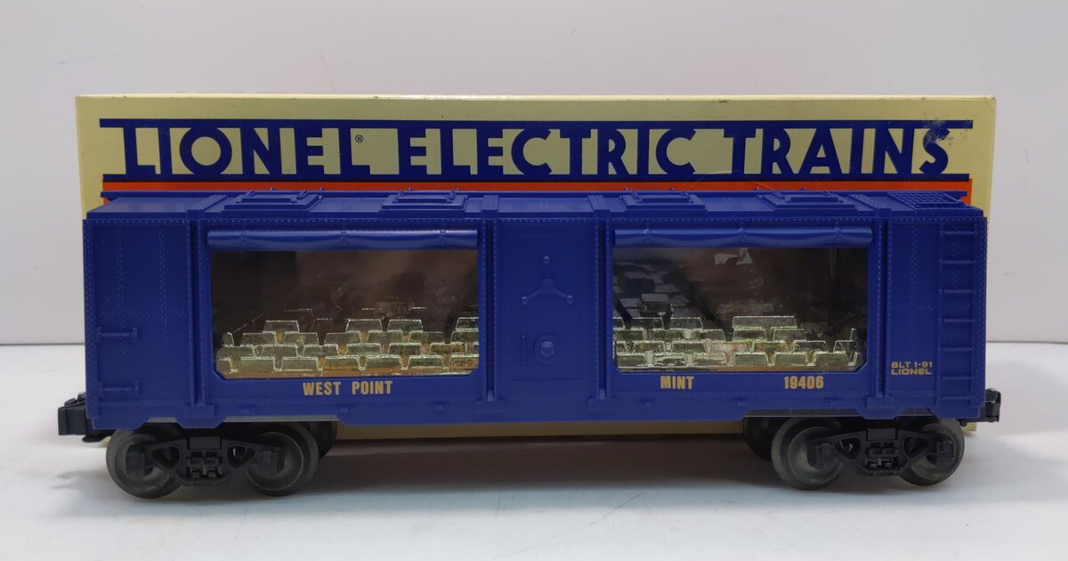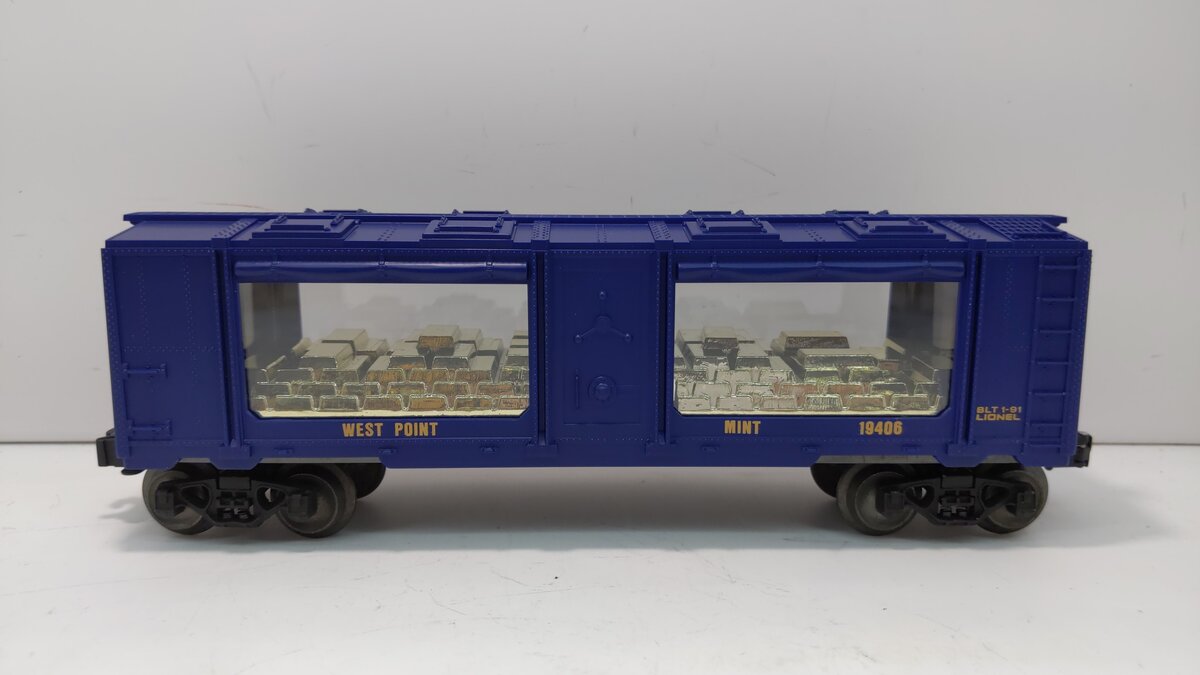 Here is a Lionel 6-19406 O Gauge West Point Mint Car from 1991. This car features a load of gold bars visible through the windows, die-cast metal sprung trucks, die-cast metal operating knuckle couplers, and metal wheels and axles.