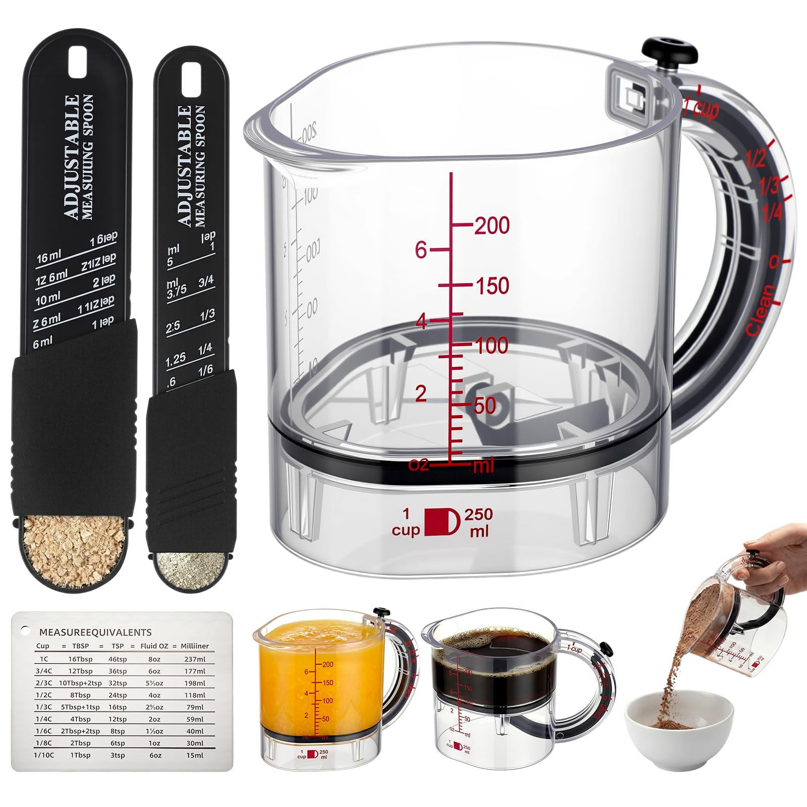 Features: With these adjustable measuring set, you'll be able to get your exact measurements every time. No more guessing what an eighth is-- you'll have it right there in front of you! This 4 in 1 measuring cup features a unique design with a sliding dial that has different measurement units, allowing you to provide precise measurements in one tool without the need for multiple tools. Specifications: Material: plastic and stainless steel Color: black and clear Size: cup capacity 200 ml Package includes: 1 Measuring Cup 2 Adjustable Measuring spoon 1 Measurement Conversion Chart Notes: Manual measurement, please allow slight errors on size. The color may exist a slight difference due to different screen displays