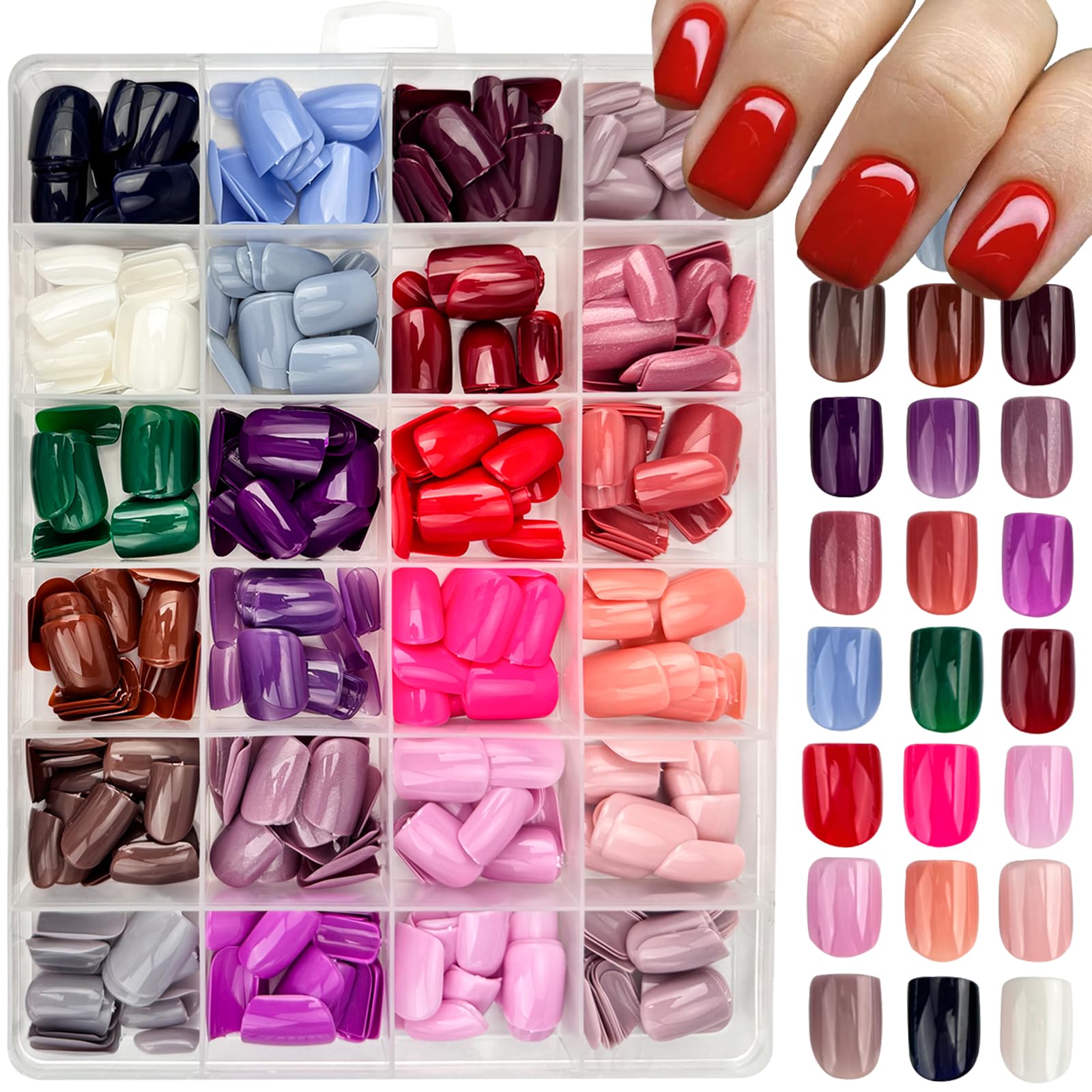576 pcs shiny glossy short square nails mixed with 24 trendy glossy colors short square nails press ons perfect for everyday wear. You can wear hot pink nails, back nails, red nails, burgundy nals, brown nails, grey nails, yellow nails, maroon nails, coffee nails, nude pink nails, nude nails, jelly nails, pink nails, lime nails, olive green nails, blue nails, purple nails and white nails.