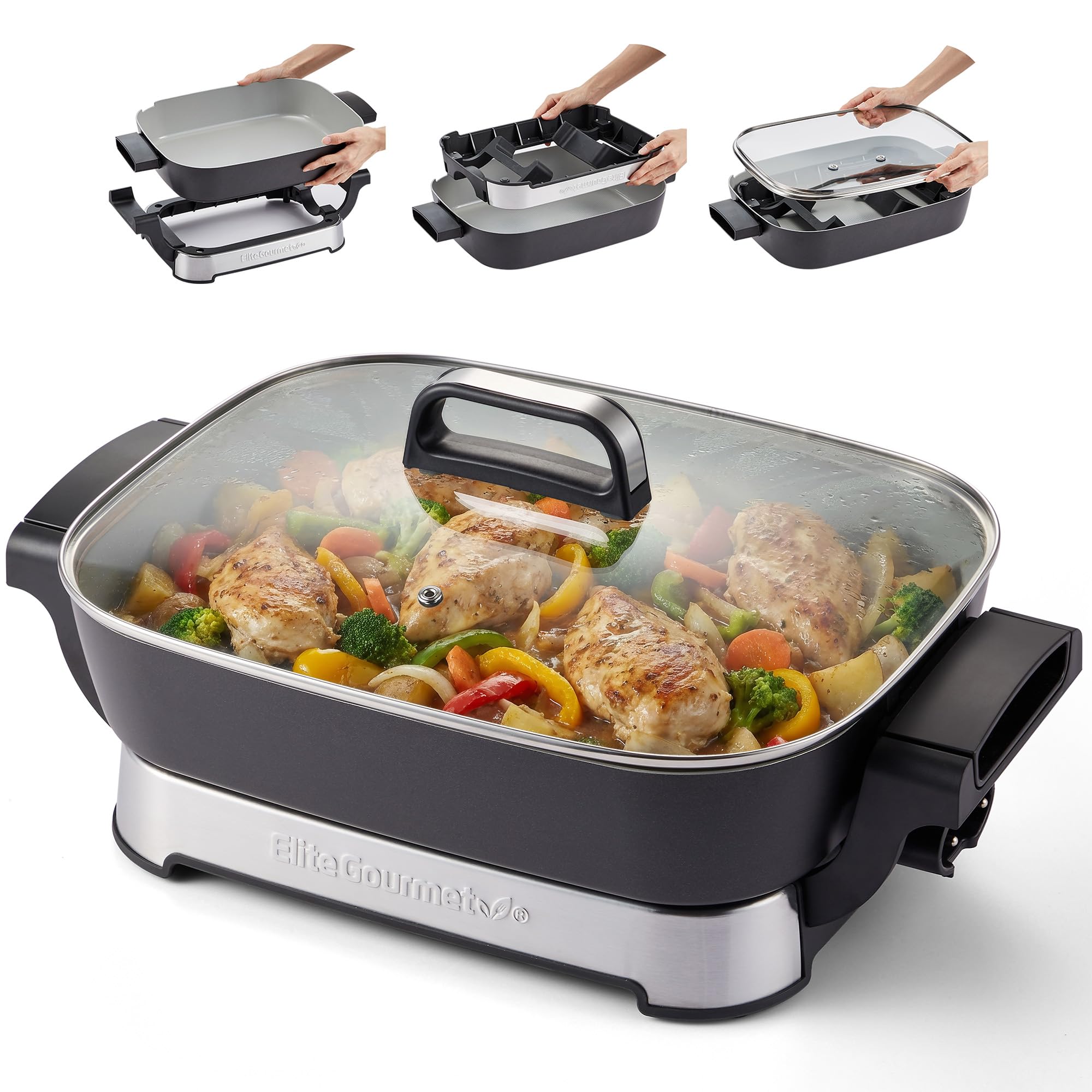 Elite Gourmet 15" x 12" x 3" Stow-Away Foldable Electric Skillet, Ceralast™ PFAS Free Ceramic, 1500W Rapid Heat, Dishwasher Safe Pan & Lid, Black/Grey