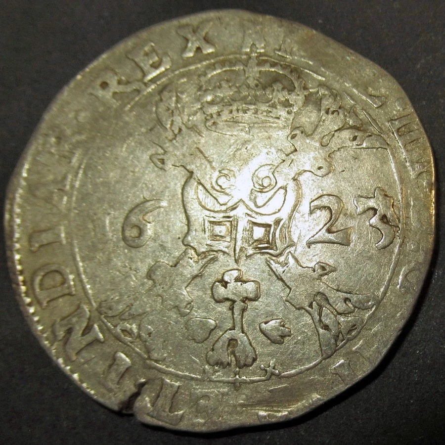 On the obverse is a crowned Saint-Andrew's-cross with the flint