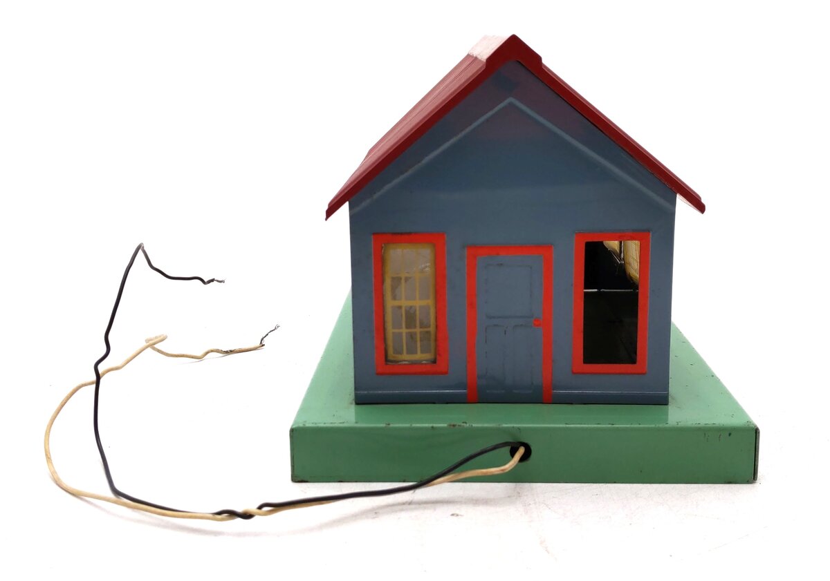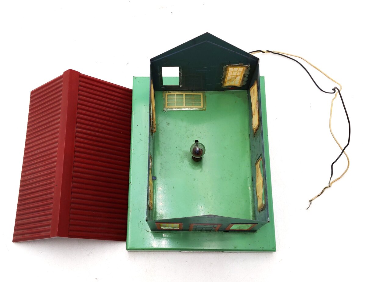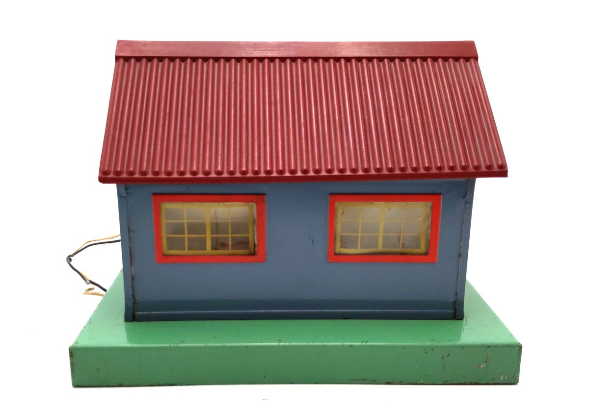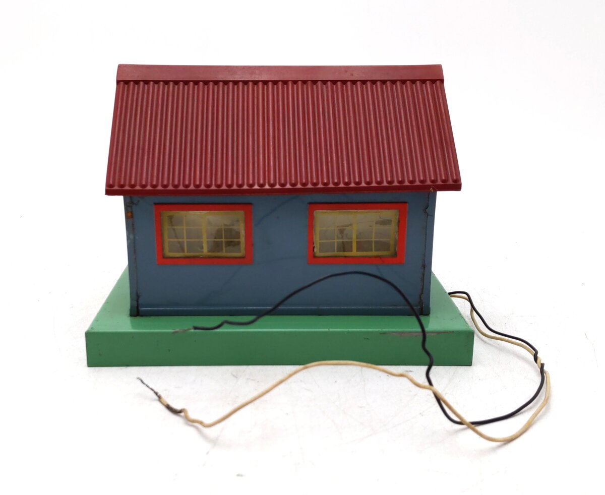 Here is an American Flyer 764 Express Office. This building features metal construction with a plastic roof, frosted windows, and interior illumination. It has a base footprint of 7 inches by 5.5 inches and stands 5.25 inches tall.