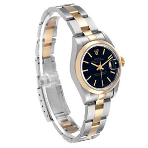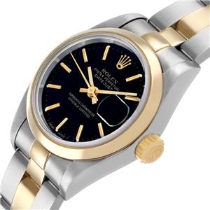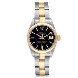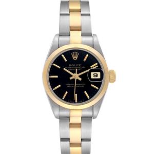 Black dial with baton hour markers. Date calendar at 3 o'clock aperture. |
