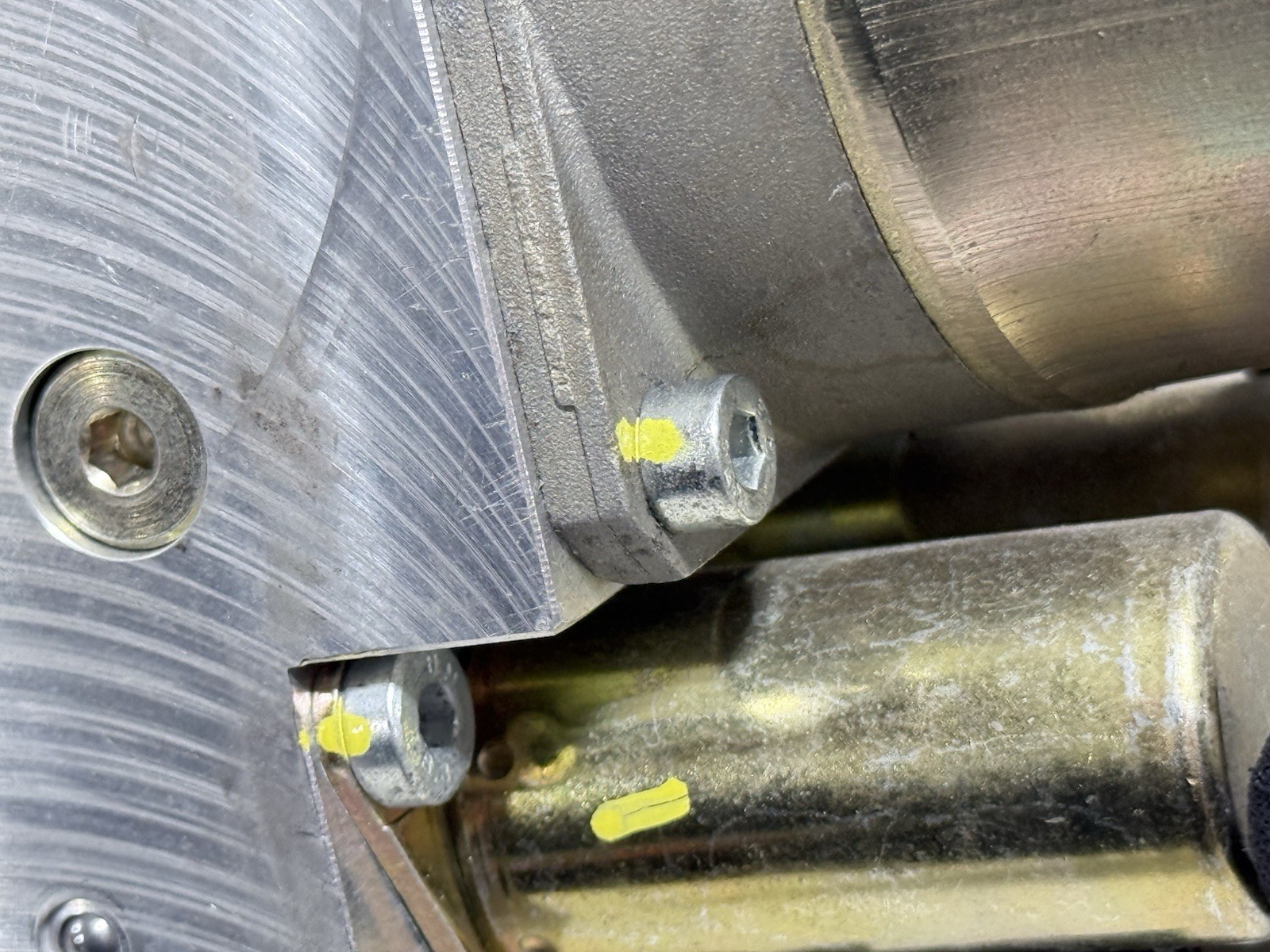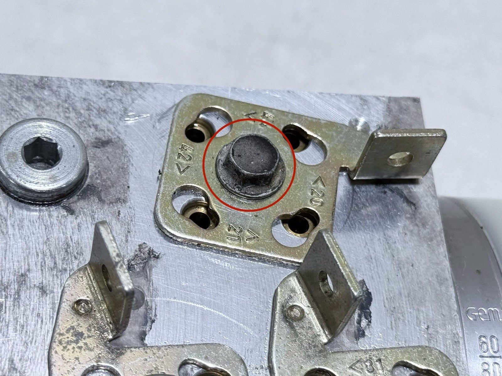 Missing the original bolt shown circled in the photo. The first few threads were stripped, so it was replaced with a slightly longer bolt. It functions as it should and tightens down firmly.