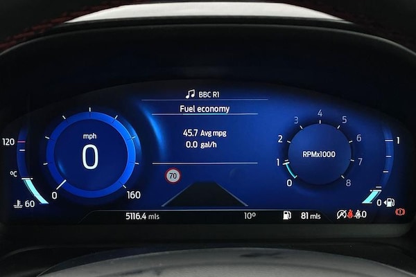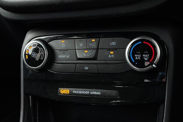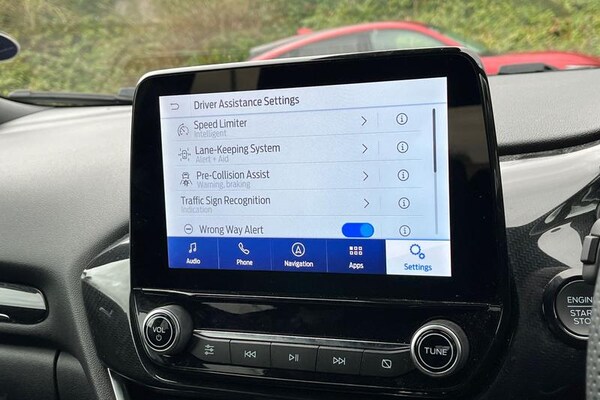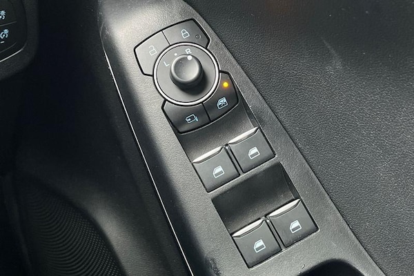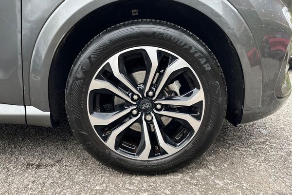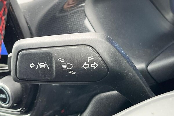 Driver impairment monitor, Emergency call service, Ford easy fuel, Full digital 12.3 instrument cluster, Lane keeping aid with lane departure warning, Power assist steering, Power start button, Rear parking sensor, Selectable drive modes(Normal, Eco, Sport, Slippery and Trail), Speed sign recognition, Automatic headlights with auto high beam, Automatic rain sensing wipers, LED rear lamps, Power foldable heated door mirrors with puddle lamps, Projector headlamps with LED day time running lights and front fog lamps, Quickclear heated windscreen, Rear side wing doors, Rear wiper, ST-Line body styling kit with unique grille, Third brake light, 3 seat bench in 2nd row, Centre console with armrest and stowage, Ford megabox extended bootspace, Front and rear head restraints, Front floor mats, Manual 2 way passenger seat adjustment, Manual 4 way driver seat adjust with lumbar adjustment, Single front passenger seat, ST- Line cloth trim with red stitching, ST-Line flat bottomed sensico leather steering wheel with leather handbrake and aluminium gear knob, 3 rear seatbelts, Child safety lock, Electronic stability control (ESC) and hill start assist, Pedestrian/cyclist detection & post-collision braking, Pre collision assist system, Tyre pressure monitoring system (TPMS)