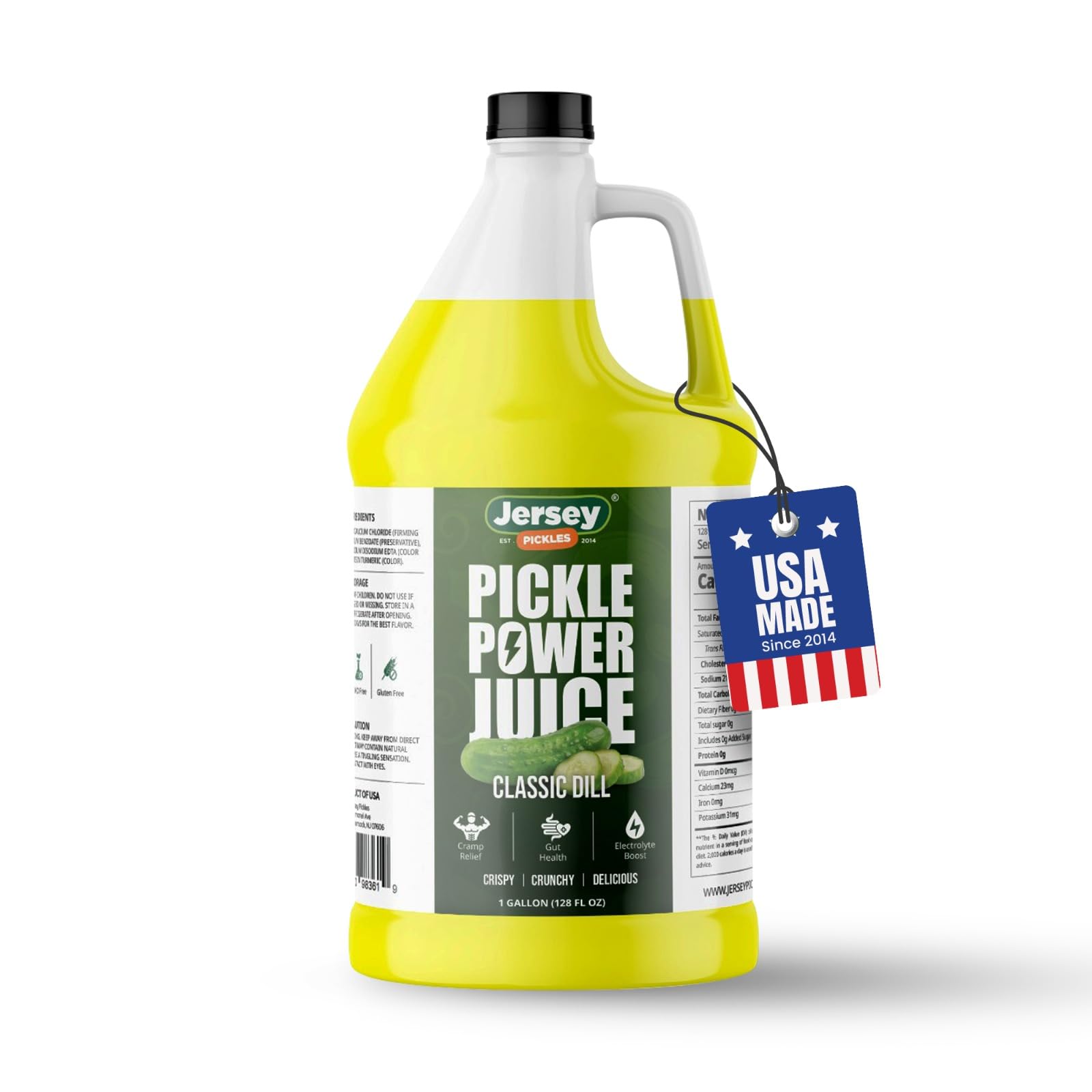 Feel the power with Jersey Pickles’ Pickle Power Juice — our premium pickle brine available in Classic Dill, Sweet, and Spicy varieties. Crafted from authentic pickle brine and made without artificial additives, this gallon-size juice delivers bold, tangy flavor and naturally occurring electrolytes. A versatile favorite for hydration, pickleback shots, cocktails, marinades, and everyday cooking. Enjoy it straight from the jug or use it to add a punch of flavor to your recipes. Vegan, gluten-free, and proudly crafted in New Jersey, USA since 2014.