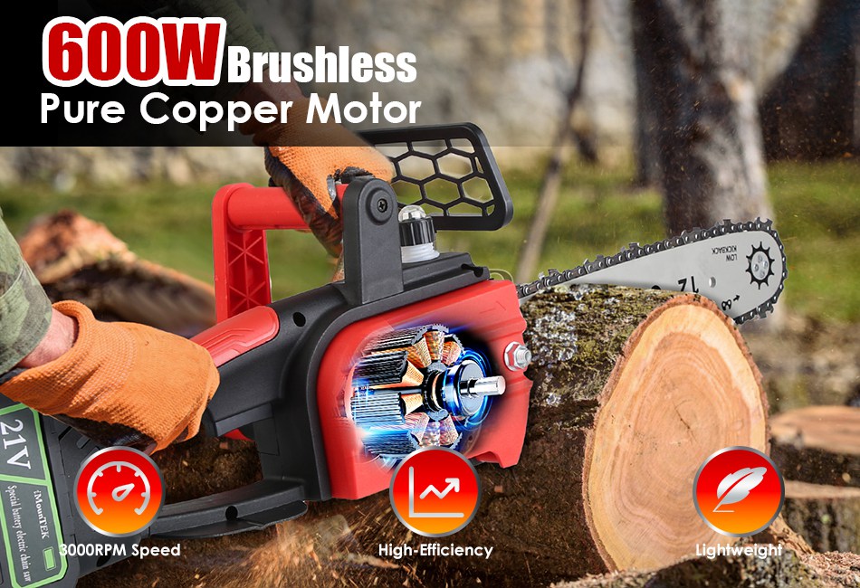 With a high-efficiency brushless pure copper 600W motor that achieves a blazing speed of 3000RPM, this chainsaw delivers strong cutting performance effortlessly and quickly. Perfect for professional landscapers and gardening enthusiasts alike. Featuring a safety switch that requires simultaneous pressing of the start button while holding the chainsaw steady to minimize the risk of injury from sudden starts or unexpected movements. Automatic oil lubrication system promotes smoother cuts and extend the chain's life by reducing friction-induced wear and tear. An essential tool for all your cutting and trimming needs, including tree trimming, wood cutting, branch pruning, firewood preparation, and landscaping projects.