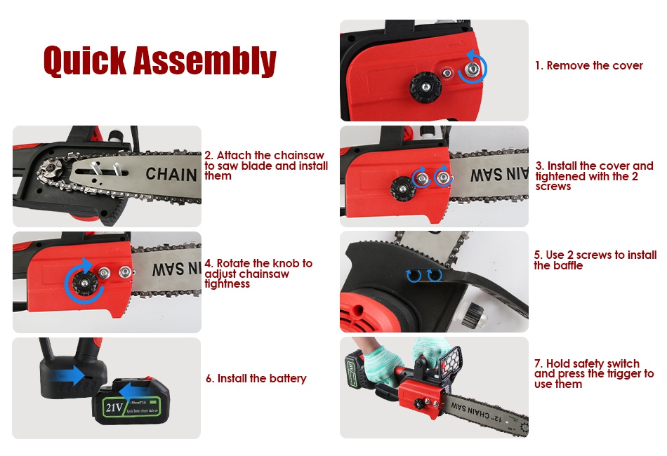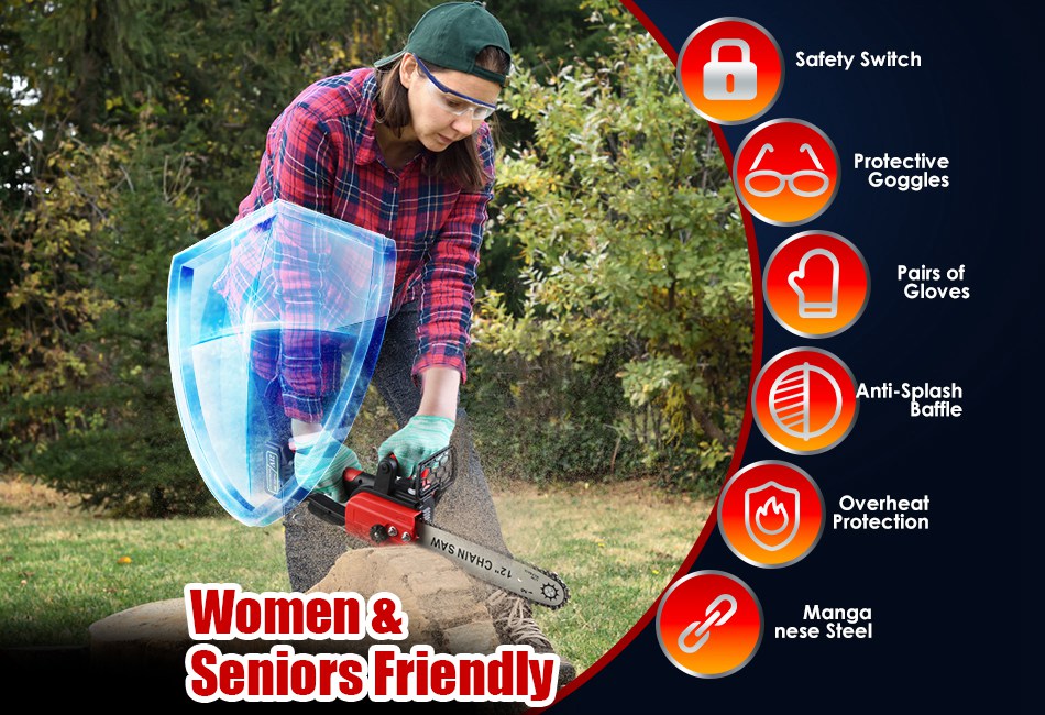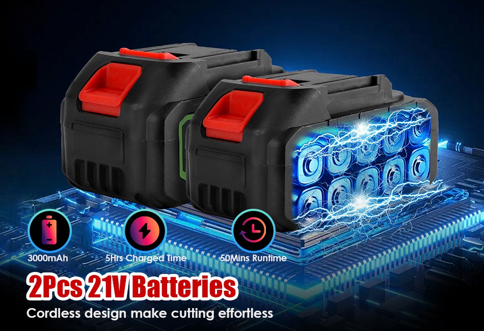 - Cordless,Lightweight & Lasting:Crafted from sturdy ABS body and premium manganese steel chainsaw,this robust 12inch cordless chainsaw ensures long lasting use. Weighing about 5.21lbs and powered by 2Pcs 3000mAh battery,lightweight construction and cordless design eliminates the hassle of tangled cords or limited mobility.