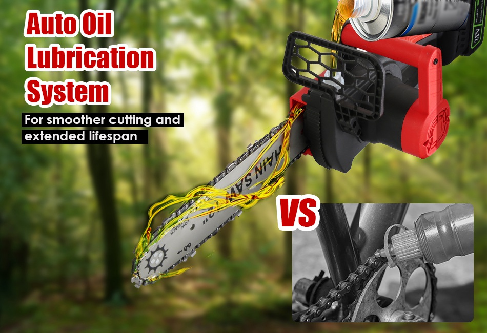 - Auto Oil Lubrication System:Designed with auto oil lubrication system during operation,not only promotes smoother cuts but also significantly extends the life of the chain by reducing wear and tear caused by friction. Additionally,transparent oil window with scales offers clear indications for refilling oil levels at a glance.