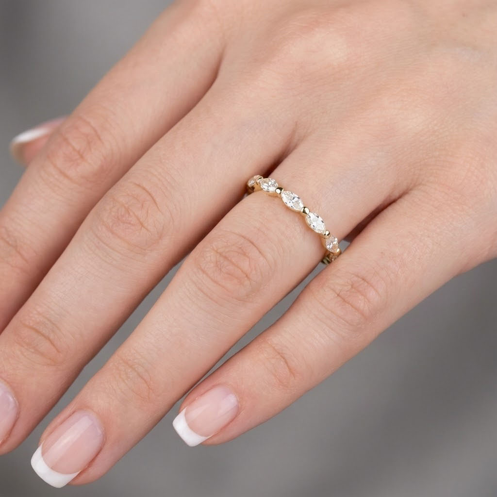 Celebrate your love with this exquisite Art-Deco inspired eternity wedding band, featuring a stunning display of marquise-cut natural diamonds set in shared-prongs. Each stone, radiating with brilliant clarity, encapsulates the timeless elegance of your commitment. Ideal for anniversaries or as a beautiful complement to your engagement ring, this piece promises to bring joy for years to come. Crafted with exceptional artistry, it symbolizes enduring love, making it a treasured investment in both beauty and sentiment.