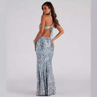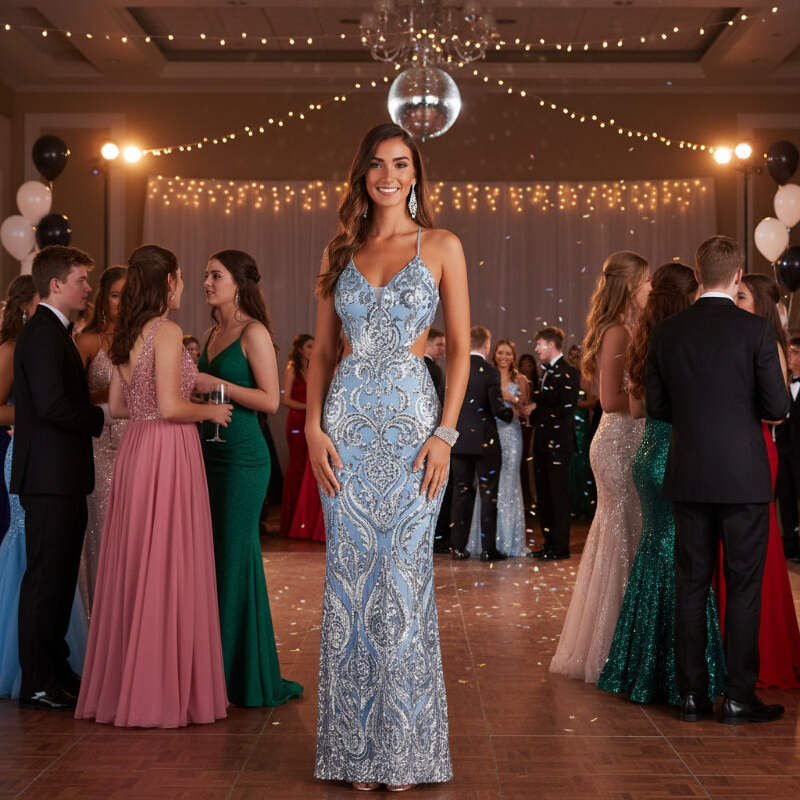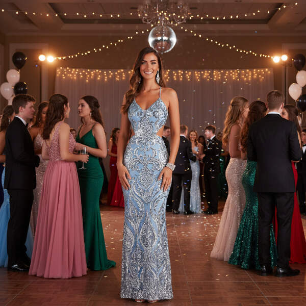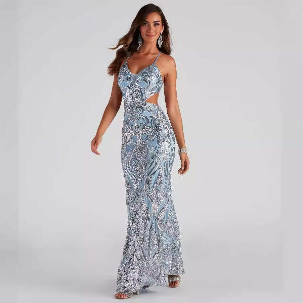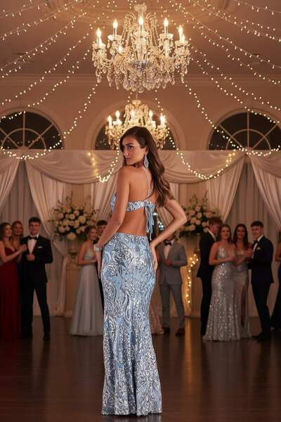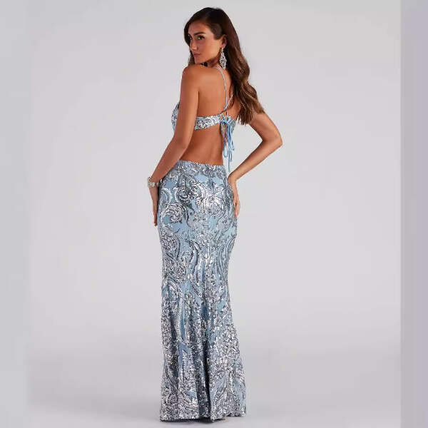 Imagine walking into that upscale gala, the chandelier lights catching every sequin as you move, heads turning as the open back reveals just the right amount of drama. You're standing at the champagne bar, the v-neck framing your confidence perfectly, feeling like the most elegant version of yourself. This is the sequin maxi dress that transforms ordinary evenings into unforgettable memories - whether you're attending a formal wedding, celebrating at a black-tie event, or making your grand entrance at that milestone celebration. The light blue sequins shimmer with every step, the floor-length silhouette flows gracefully, and you're not just wearing a dress - you're owning the moment with effortless glamour.