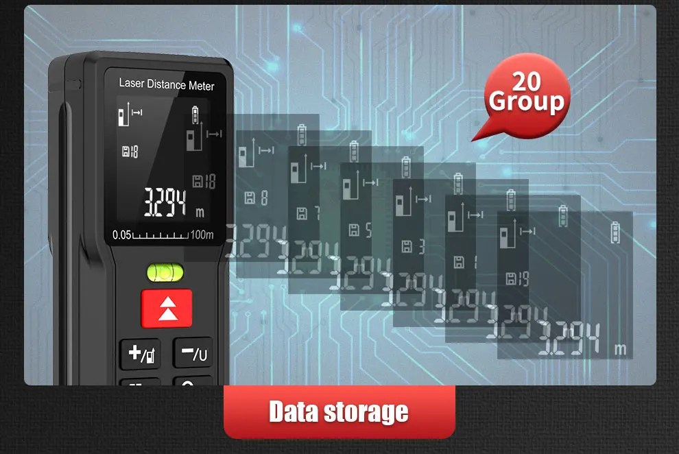 Easily switch between m / ft / in / ft+in. Stores up to 20 data records for easy recall and review, ideal for planning, estimating, and professional work.
