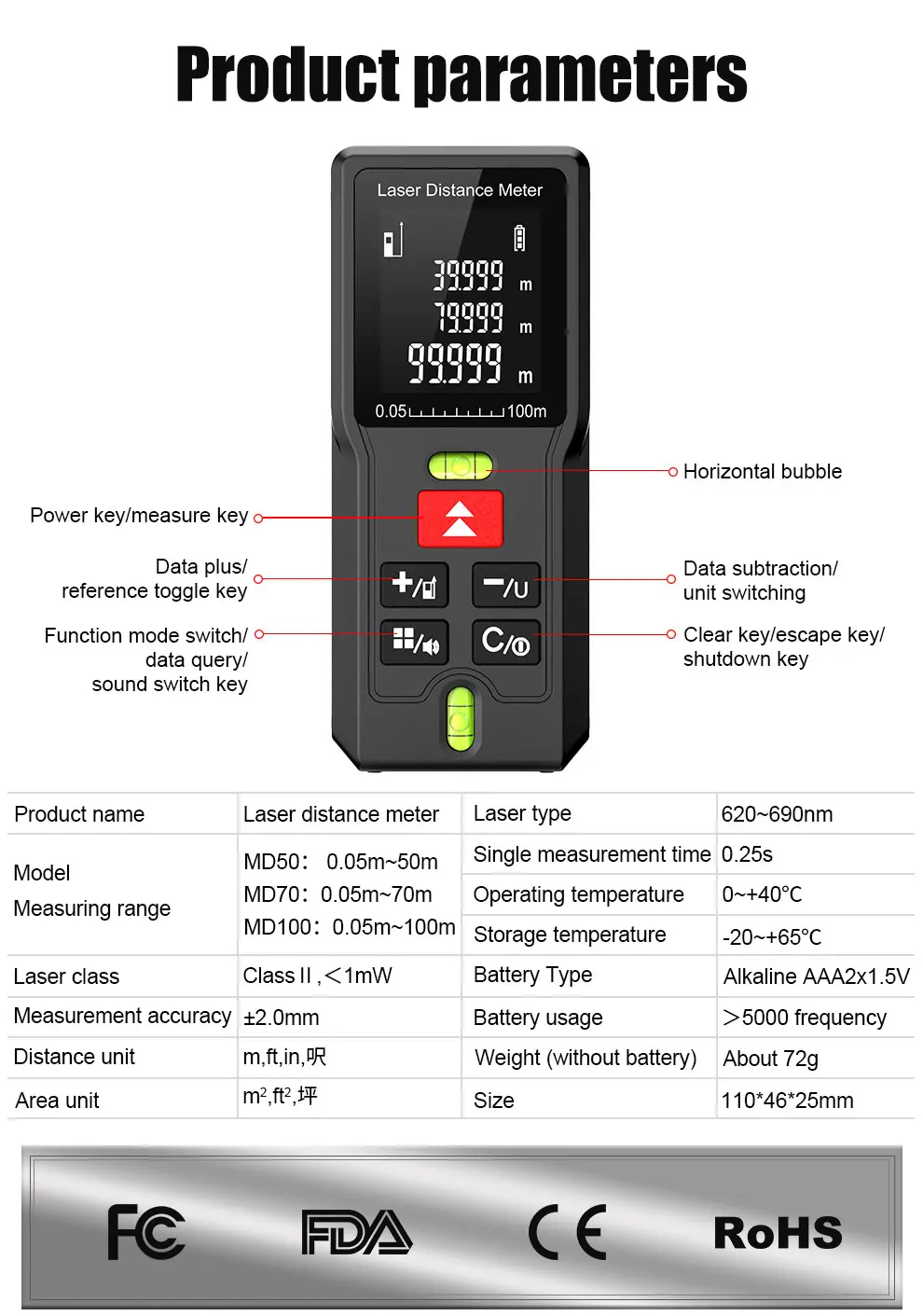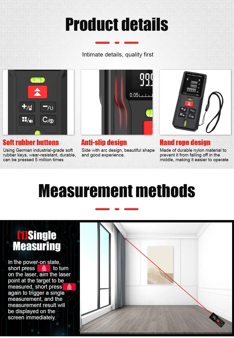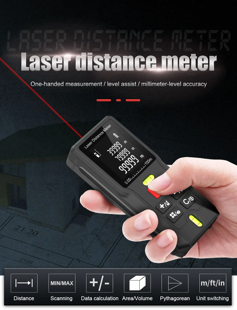 BOAYAL Laser Measure, Laser Distance Meter with 2 Bubble Levels, 164ft 50m, 197ft 60m, 230ft 70m, 328ft 100m, ±1/16 inch Accuracy, Backlit LCD Display, Area/Volume/Indirect Measurement, in/Ft/Ft+in/M, Data Memory, Laser Measurement Device, Laser Measuring Tool, Electronic Tape Measure, Digital Laser Tape Measure