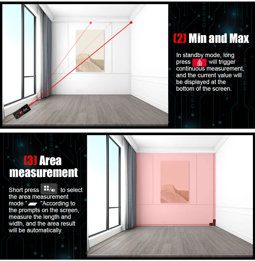 Large backlit LCD display ensures clear visibility in low-light environments. Mute mode lets you turn measurement beeps on or off—perfect for libraries, offices, classrooms, or quiet job sites.