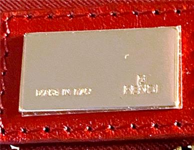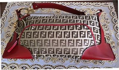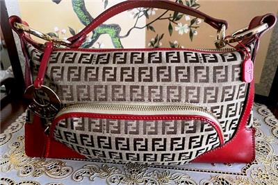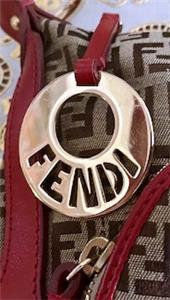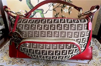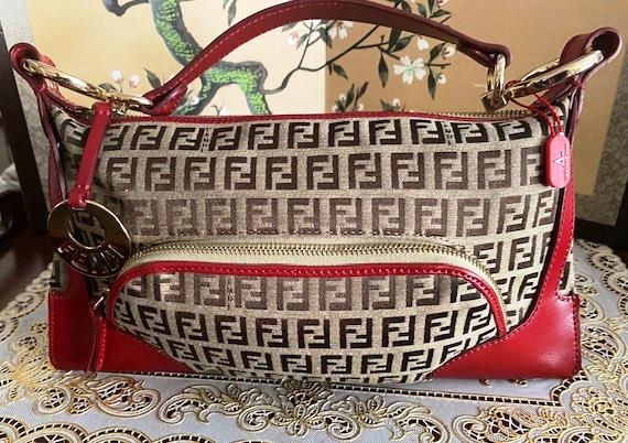This is a really beautiful Fendi Zucchino canvas with Red Leather Trim Shoulder Handbag in excellent, unblemished, never-used condition.