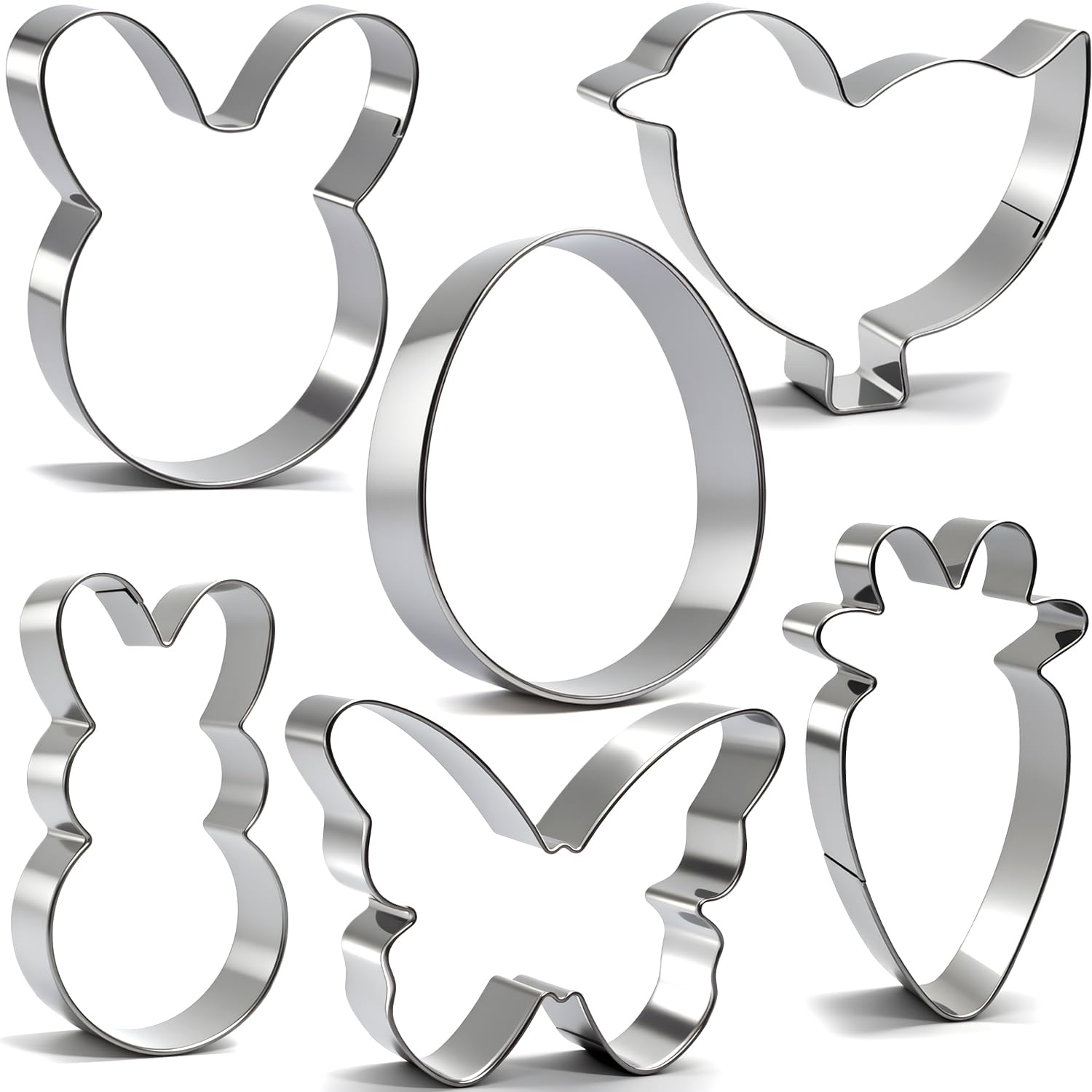 VTUGP 6Pcs Large 4'' Easter Cookie Cutter Shapes Metal Stainless Steel Spring Cookie Cutter Set Good for Spring Themed Holiday Party Baking or Decoration SupplyPRODUCT DIMENSION6 Pieces Different Shapes Easter Themed Cutters:Bunny / Rabbit Cookie Cutter: 5.2 x 10.3 cm = 2.05 x 4.06 inch,Bunny Head / Bunny Face Cookie Cutter: 8.4 x 10.2 cm = 3.31 x 4.02 inch,Easter Egg Cookie Cutter: 8 x 9.8 cm = 3.15 x 3.86 inch,Chicken Cookie Cutter: 10.2 x 8 cm = 4.02 x 3.15 inch,Carrot Cookie Cutter: 5.1 x 10.2 cm = 2.01 x 4.02 inch,Butterfly Cookie Cutter: 10 x 7.4 cm = 3.94 x 2.91 inch.All the cutters depth is 2.5 cm = 0.98 inch.PRODUCT FEATUREPremium: Made of high-quality stainless steel, sturdy and keep shape.Safe Design: The rolled top edges and smooth surface will protect your fingers during the pressing and cutting process. Easter cookie cutter variety pack safe for kids and adults to use.Easy to Clean: Hand wash or Dishwasher safe. Tips: Wiping dry them before storing!DIY Unique Styes: Large Easter cookie cutters easy to DIY your favorite easter bunny head, egg, chicken, rabbit, carrot, butterfly shapes patterns, making baking fun with your kids.