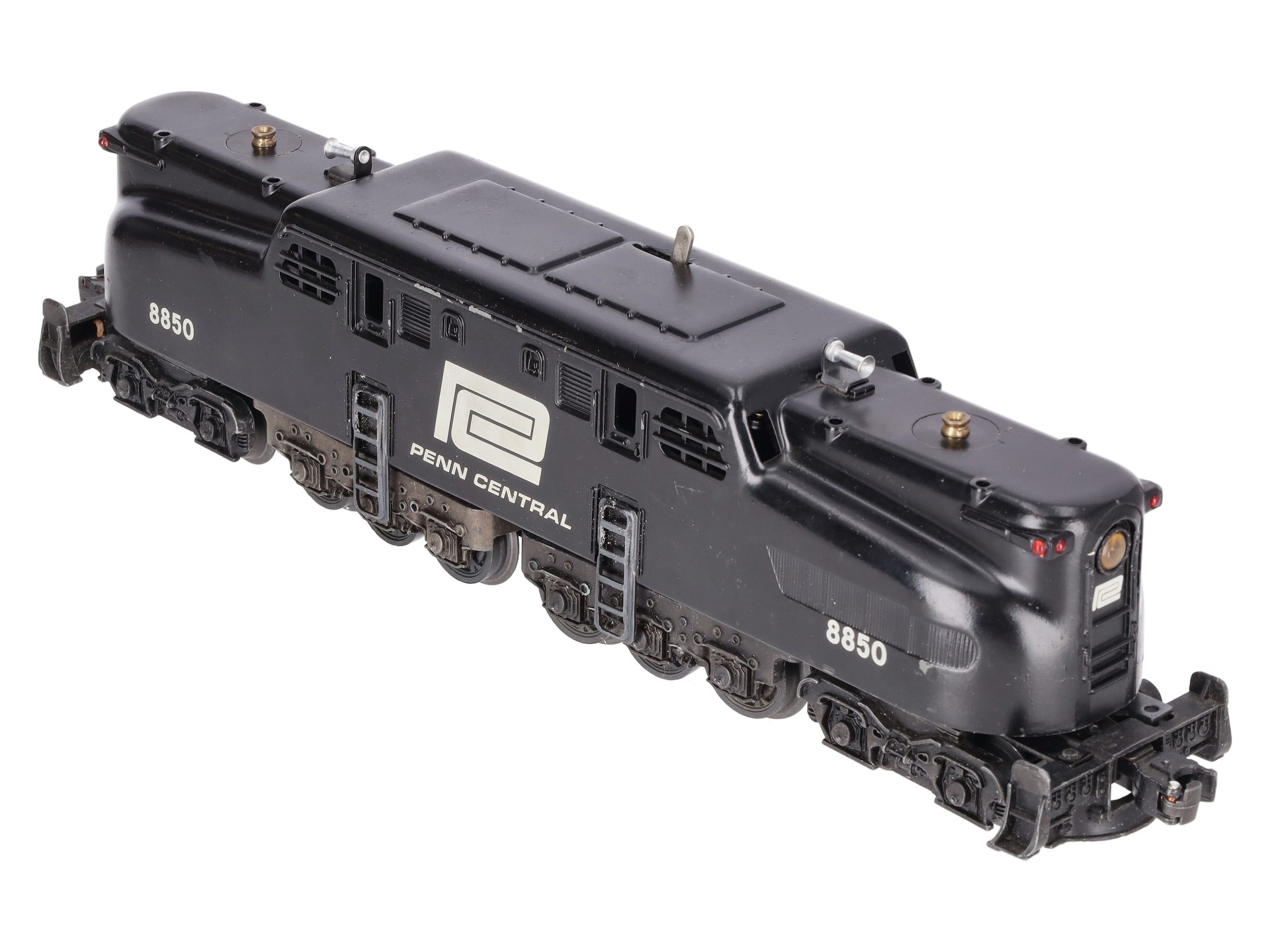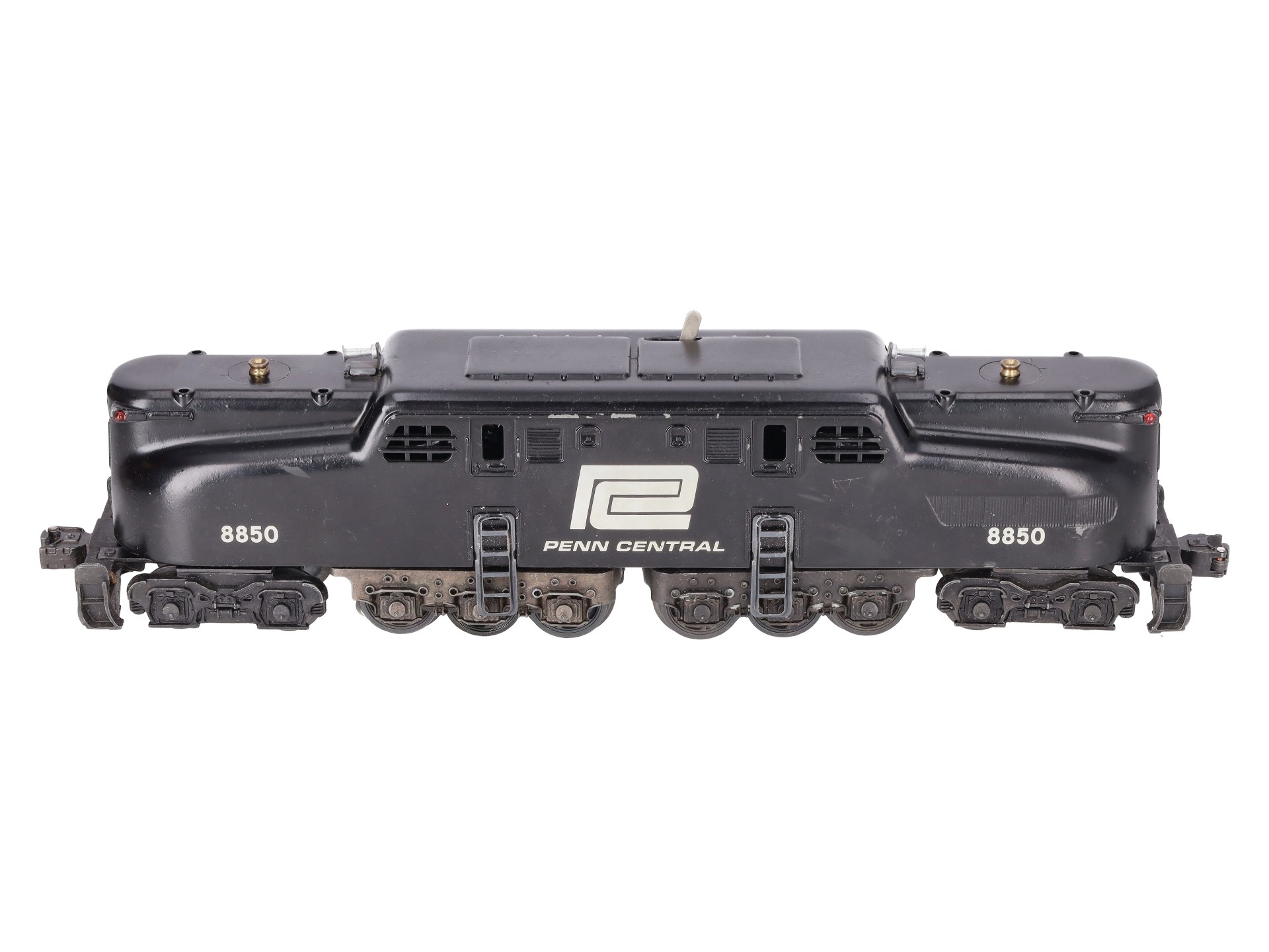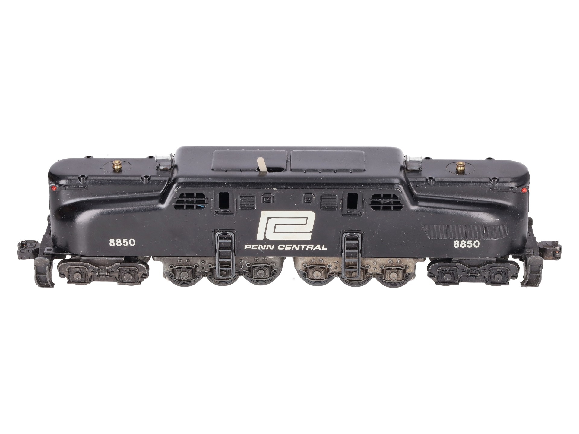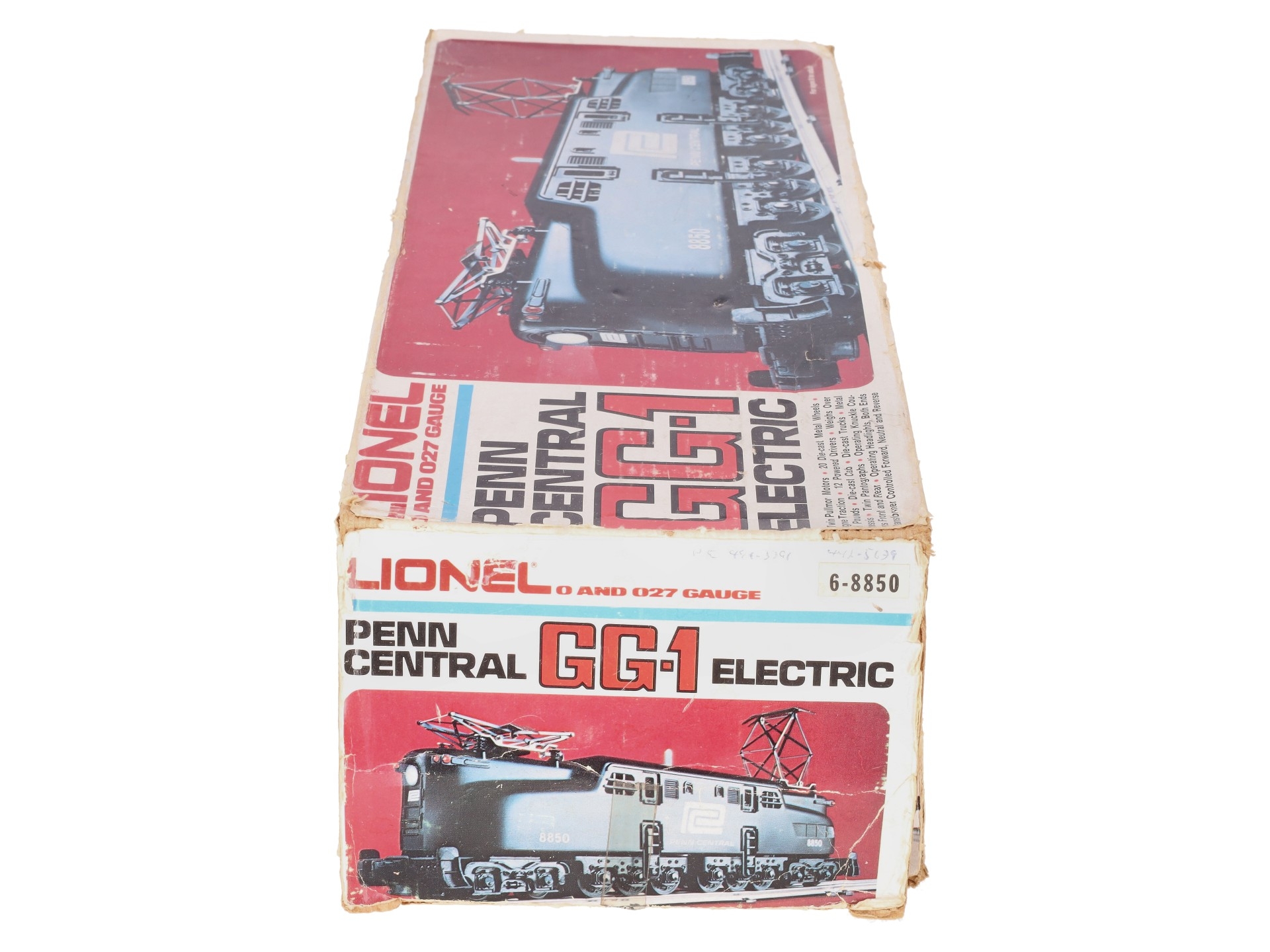 This is a Lionel 6-8850 O Gauge Penn Central GG-1 Electric Locomotive #8850 from 1978-79. Features include twin Pullmor motors, 20 die-cast metal wheels, magnetraction, 12 powered drivers, weighs over 6 1/2 pounds, a die-cast cab, die-cast trucks, metal chassis, twin pantographs, operating knuckle couplers on front and rear, operating headlights on both ends, transformer controlled forward, neutral and reverse.