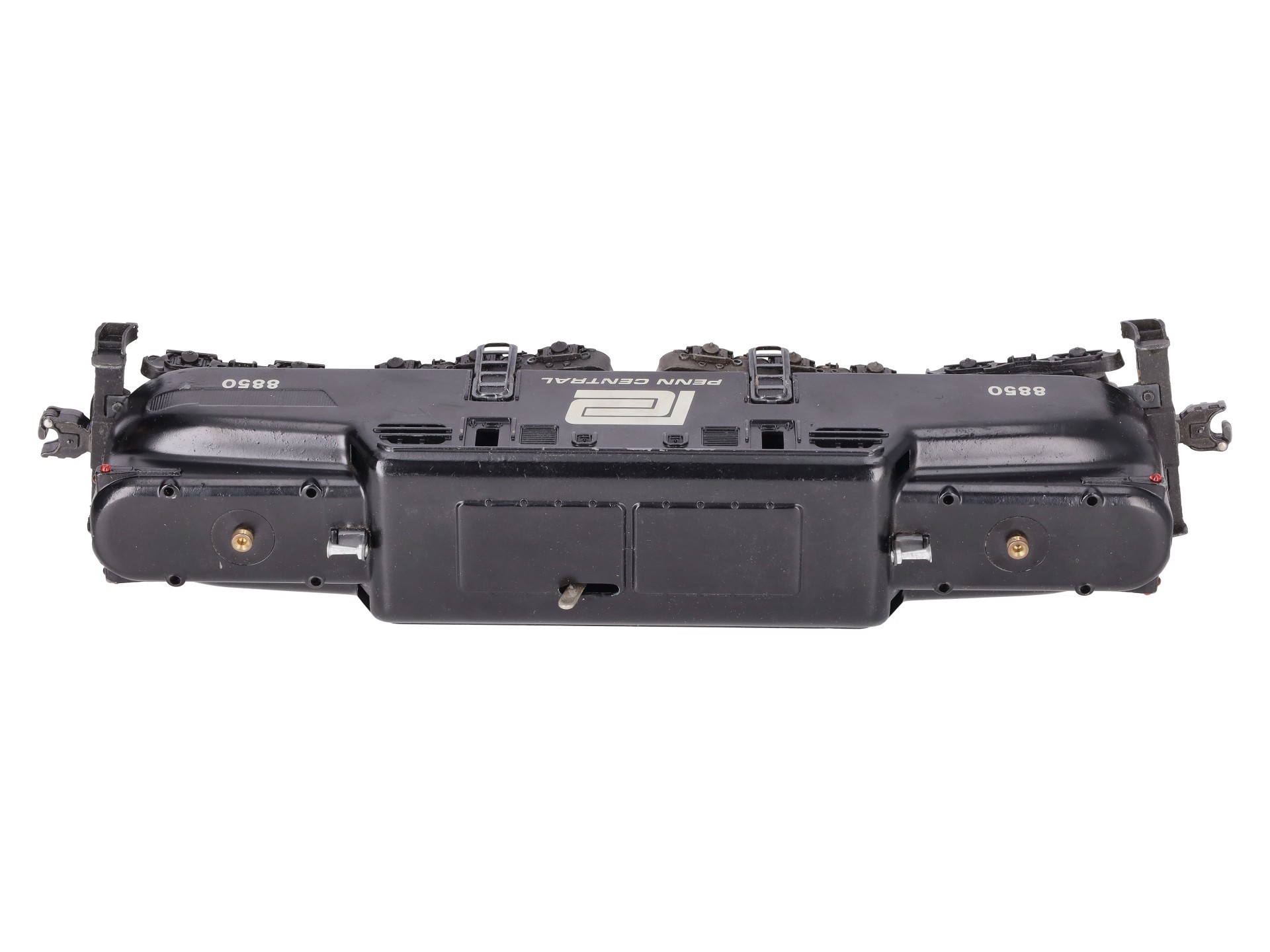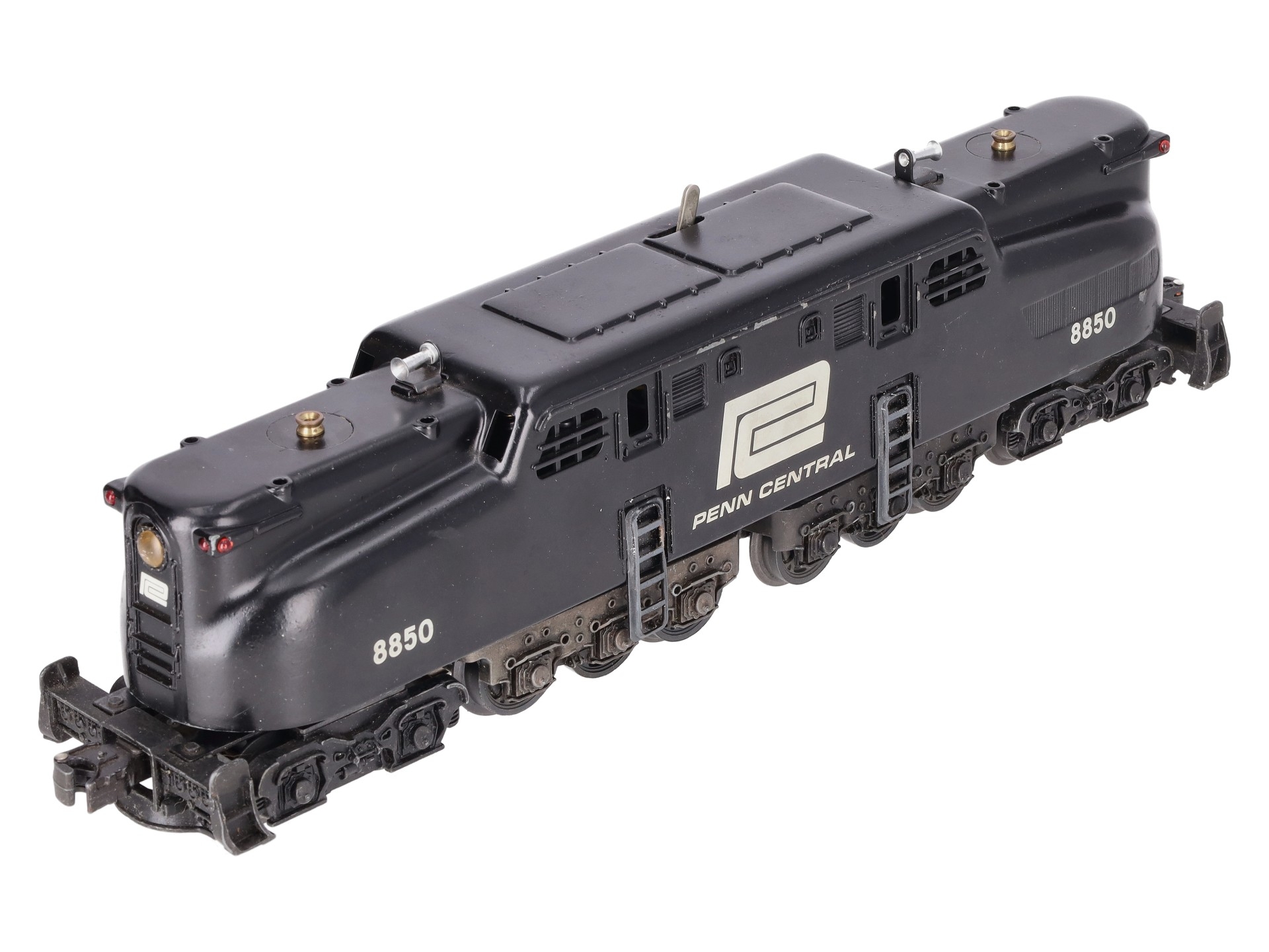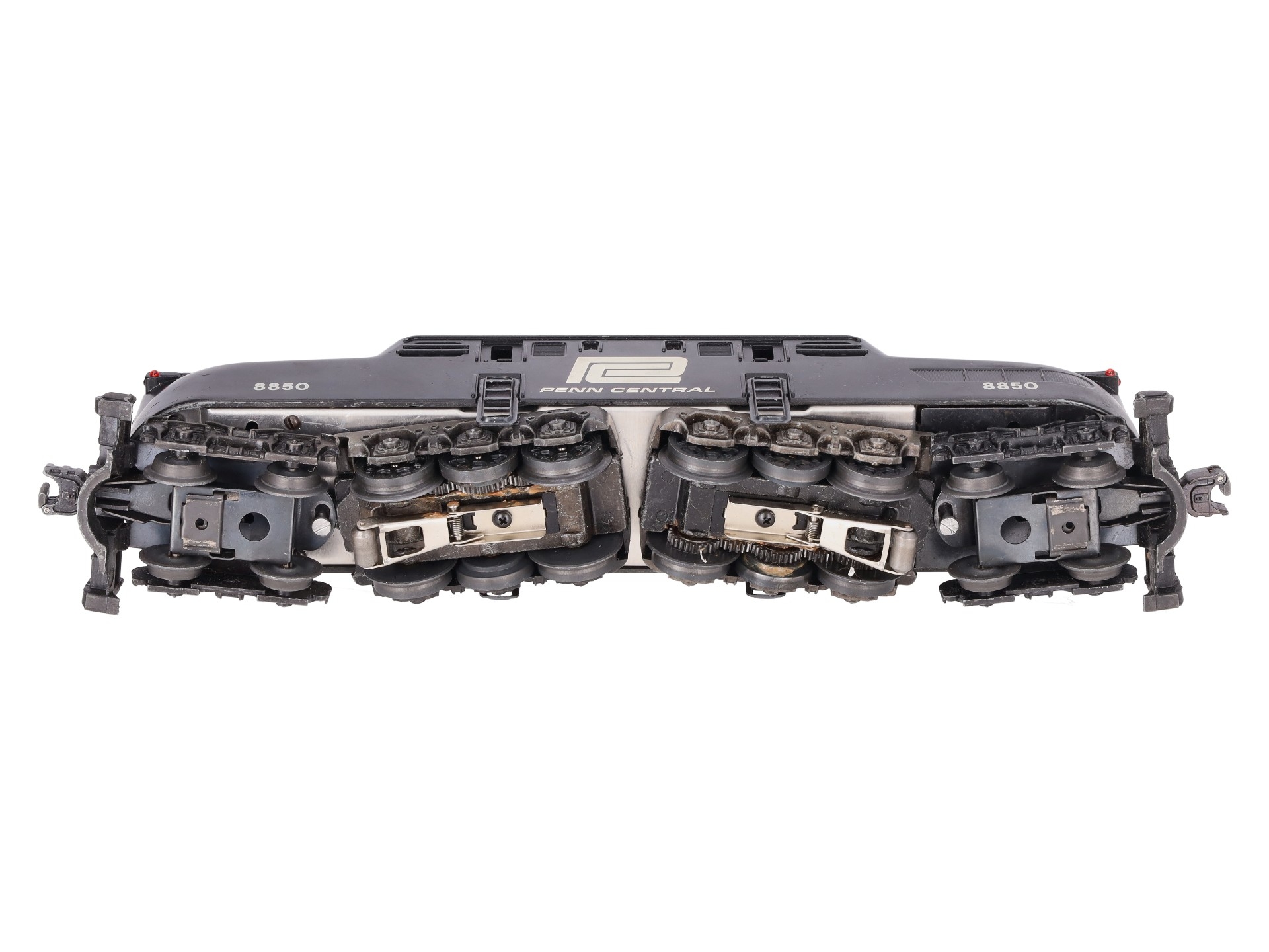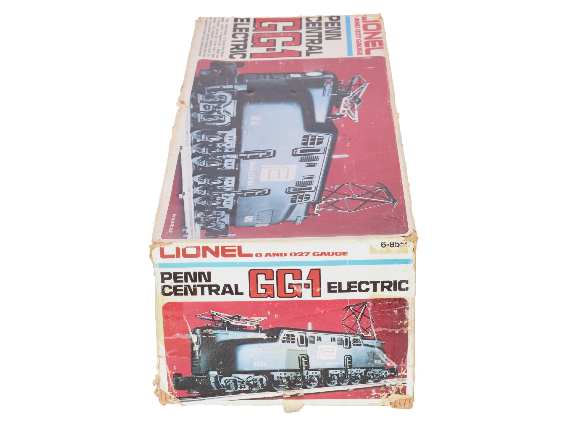This is a Lionel 6-8850 O Gauge Penn Central GG-1 Electric Locomotive #8850 from 1978-79. Features include twin Pullmor motors, 20 die-cast metal wheels, magnetraction, 12 powered drivers, weighs over 6 1/2 pounds, a die-cast cab, die-cast trucks, metal chassis, twin pantographs, operating knuckle couplers on front and rear, operating headlights on both ends, transformer controlled forward, neutral and reverse.