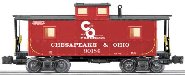 This is a Lionel 6-27629 O Gauge Chesapeake & Ohio Northeastern Caboose #90184. It features die-cast metal trucks and operating couplers, Hidden uncoupling tabs, Separately applied metal underframe details, and a Smoke unit with On/Off.