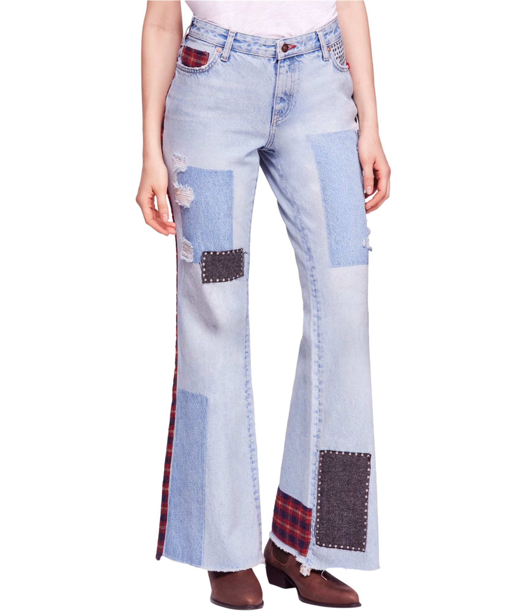 PATCHWORK CHIC: Make a statement in these Free People Women's Mixed Patch Wide Leg Jeans. The 100% cotton material ensures comfort while the multi-tone patches, distressed and studded accents bring a unique flair.
