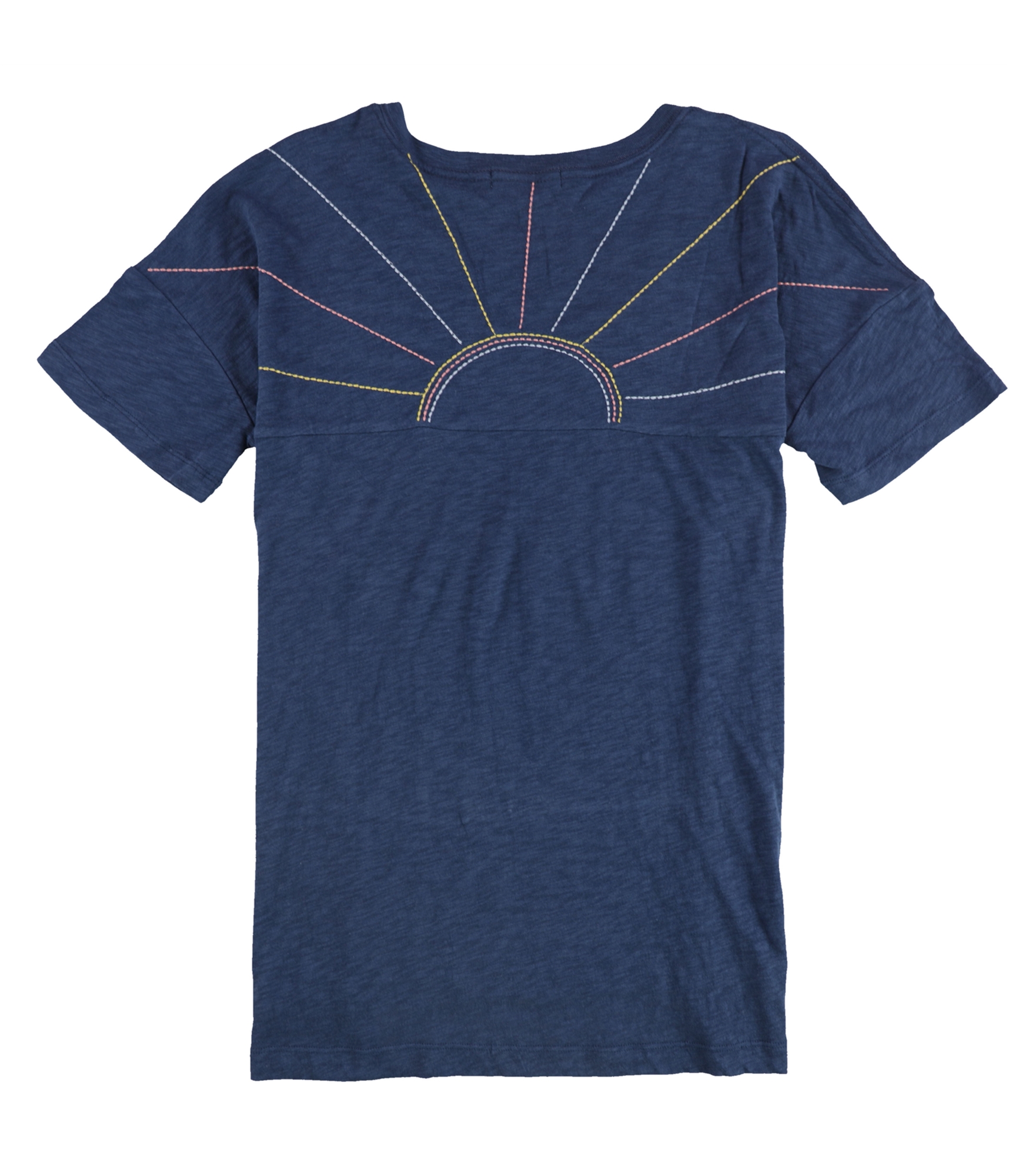 SNAGGING A CHIC SILHOUETTE: The V-neckline and short sleeves create an effortlessly chic shape, while the embroidered sun on the back adds a touch of unique charm.